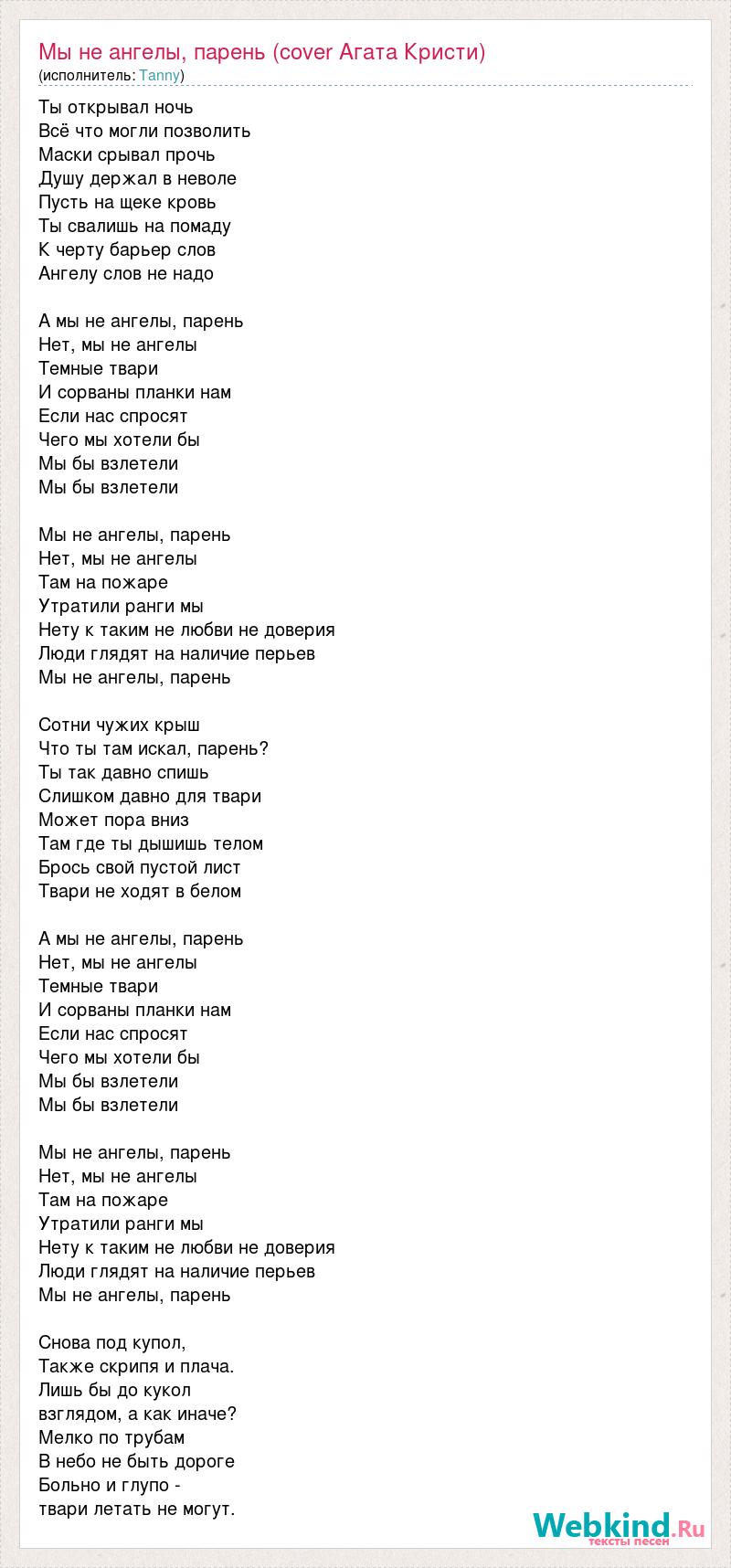 Ты открывал ночь Всё что могли позволить Маски срывал прочь Душу держал в неволе Пусть на щеке кровь Ты свалишь на помаду К черту барьер слов Ангелу слов не надо А мы не ангелы, парень Нет, мы не ангелы Темные твари И сорваны планки нам Если нас спросят Чего мы хотели бы Мы бы взлетели Мы бы взлетели Мы не ангелы, парень Нет, мы не ангелы Там на пожаре Утратили ранги мы Нету к таким не любви не доверия Люди глядят на наличие перьев Мы не ангелы, парень Сотни чужих крыш Что ты там искал, парень? Ты так давно спишь Слишком давно для твари Может пора вниз Там где ты дышишь телом Брось свой пустой лист Твари не ходят в белом А мы не ангелы, парень Нет, мы не ангелы Темные твари И сорваны планки нам Если нас спросят Чего мы хотели бы Мы бы взлетели Мы бы взлетели Мы не ангелы, парень Нет, мы не ангелы Там на пожаре Утратили ранги мы Нету к таким не любви не доверия Люди глядят на наличие перьев Мы не ангелы, парень Снова под купол, Также скрипя и плача. Лишь бы до кукол взглядом, а как иначе? Мелко по трубам В небо не быть дороге Больно и глупо - твари летать не могут.