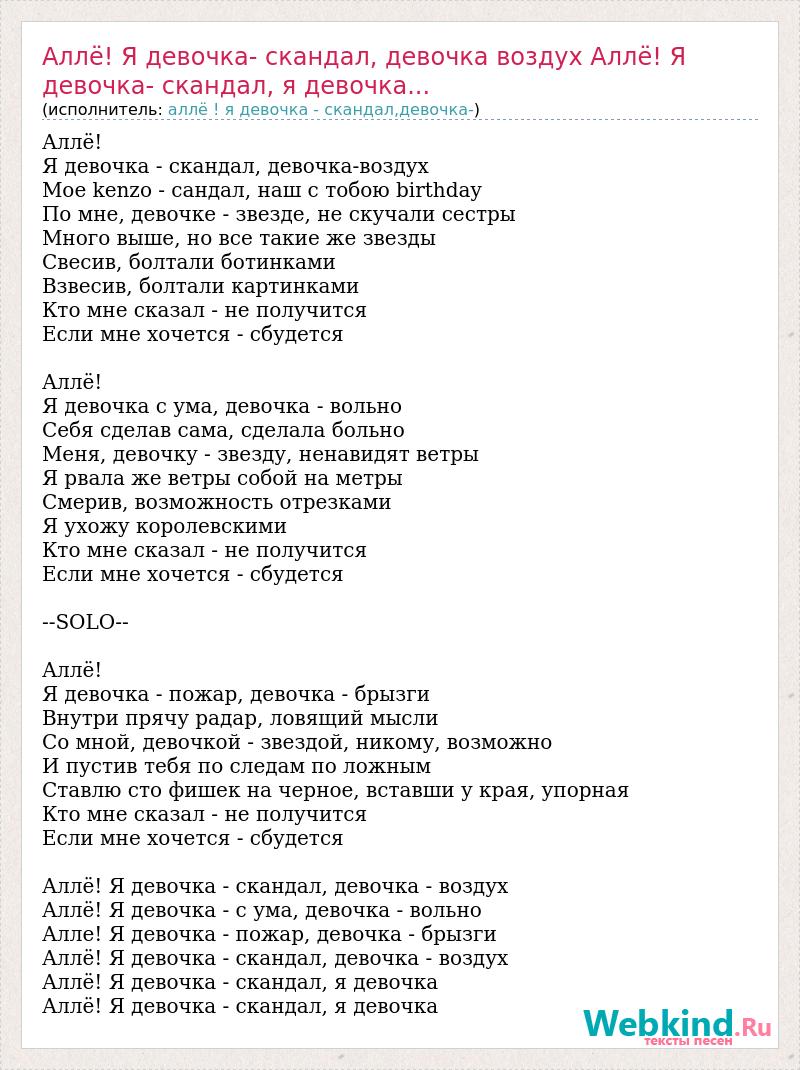 Аллё! Я девочка - скандал, девочка-воздух Мое kenzo - сандал, наш с тобою birthday По мне, девочке - звезде, не скучали сестры Много выше, но все такие же звезды Свесив, болтали ботинками Взвесив, болтали картинками Кто мне сказал - не получится Если мне хочется - сбудется Аллё! Я девочка с ума, девочка - вольно Себя сделав сама, сделала больно Меня, девочку - звезду, ненавидят ветры Я рвала же ветры собой на метры Смерив, возможность отрезками Я ухожу королевскими Кто мне сказал - не получится Если мне хочется - сбудется --SOLO-- Аллё! Я девочка - пожар, девочка - брызги Внутри прячу радар, ловящий мысли Со мной, девочкой - звездой, никому, возможно И пустив тебя по следам по ложным Ставлю сто фишек на черное, вставши у края, упорная Кто мне сказал - не получится Если мне хочется - сбудется Аллё! Я девочка - скандал, девочка - воздух Аллё! Я девочка - с ума, девочка - вольно Алле! Я девочка - пожар, девочка - брызги Аллё! Я девочка - скандал, девочка - воздух Аллё! Я девочка - скандал, я девочка Аллё! Я девочка - скандал, я девочка