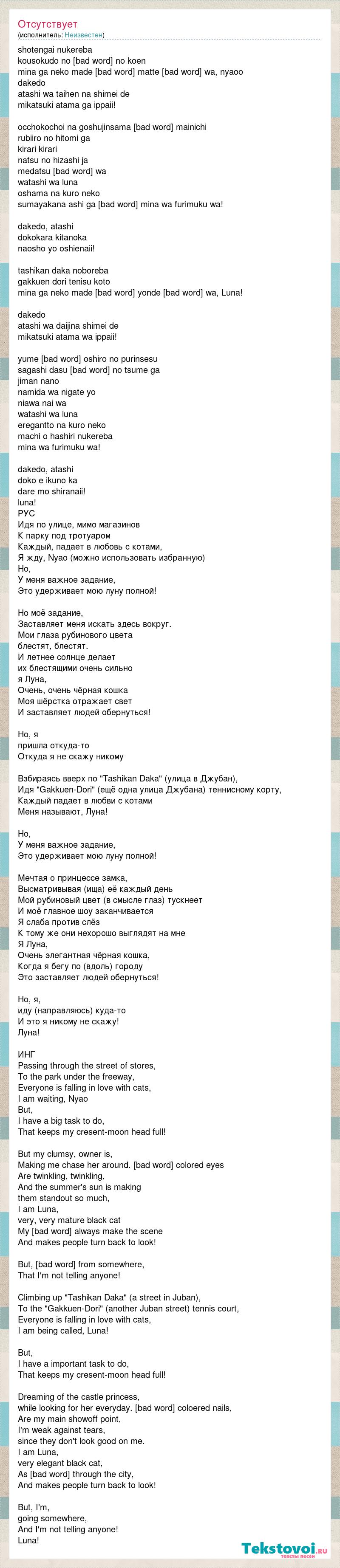 shotengai nukereba kousokudo no [bad word] no koen mina ga neko made [bad word] matte iru wa, nyaoo dakedo atashi wa taihen na shimei de mikatsuki atama ga ippaii! occhokochoi na goshujinsama oikakeru mainichi rubiiro no hitomi ga kirari kirari natsu no hizashi ja medatsu sugiru wa watashi wa luna oshama na kuro neko sumayakana ashi ga kimaru mina wa furimuku wa! dakedo, atashi dokokara kitanoka naosho yo oshienaii! tashikan daka noboreba gakkuen dori tenisu koto mina ga neko made [bad word] yonde iru wa, Luna! dakedo atashi wa daijina shimei de mikatsuki atama wa ippaii! yume miru oshiro no purinsesu sagashi dasu mainichi rubiiro no tsume ga jiman nano namida wa nigate yo niawa nai wa watashi wa luna eregantto na kuro neko machi o hashiri nukereba mina wa furimuku wa! dakedo, atashi doko e ikuno ka dare mo shiranaii! luna! РУС Идя по улице, мимо магазинов К парку под тротуаром Каждый, падает в любовь с котами, Я жду, Nyao (можно использовать избранную) Но, У меня важное задание, Это удерживает мою луну полной! Но моё задание, Заставляет меня искать здесь вокруг. Мои глаза рубинового цвета блестят, блестят. И летнее солнце делает их блестящими очень сильно я Луна, Очень, очень чёрная кошка Моя шёрстка отражает свет И заставляет людей обернуться! Но, я пришла откуда-то Откуда я не скажу никому Взбираясь вверх по "Tashikan Daka" (улица в Джубан), Идя "Gakkuen-Dori" (ещё одна улица Джубана) теннисному корту, Каждый падает в любви с котами Меня называют, Луна! Но, У меня важное задание, Это удерживает мою луну полной! Мечтая о принцессе замка, Высматривывая (ища) её каждый день Мой рубиновый цвет (в смысле глаз) тускнеет И моё главное шоу заканчивается Я слаба против слёз К тому же они нехорошо выглядят на мне Я Луна, Очень элегантная чёрная кошка, Когда я бегу по (вдоль) городу Это заставляет людей обернуться! Но, я, иду (направляюсь) куда-то И это я никому не скажу! Луна! ИНГ Passing through the street of stores, To the park under the freeway, Everyone is falling in love with cats, I am waiting, Nyao But, I have a big task to do, That keeps my cresent-moon head full! But my clumsy, owner is, Making me chase her around. My ruby colored eyes Are twinkling, twinkling, And the summer's sun is making them standout so much, I am Luna, very, very mature black cat My strut always make the scene And makes people turn back to look! But, I, come from somewhere, That I'm not telling anyone! Climbing up "Tashikan Daka" (a street in Juban), To the "Gakkuen-Dori" (another Juban street) tennis court, Everyone is falling in love with cats, I am being called, Luna! But, I have a important task to do, That keeps my cresent-moon head full! Dreaming of the castle princess, while looking for her everyday. My ruby coloered nails, Are my main showoff point, I'm weak against tears, since they don't look good on me. I am Luna, very elegant black cat, As I run through the city, And makes people turn back to look! But, I'm, going somewhere, And I'm not telling anyone! Luna!