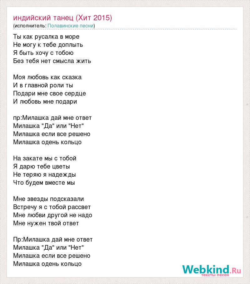 Ты как русалка в море Не могу к тебе доплыть Я быть хочу с тобою Без тебя нет смысла жить Моя любовь как сказка И в главной роли ты Подари мне свое сердце И любовь мне подари пр:Милашка дай мне ответ Милашка "Да" или "Нет" Милашка если все решено Милашка одень кольцо На закате мы с тобой Я дарю тебе цветы Не теряю я надежды Что будем вместе мы Мне звезды подсказали Встречу я с тобой рассвет Мне любви другой не надо Мне нужен твой ответ Пр:Милашка дай мне ответ Милашка "Да" или "Нет" Милашка если все решено Милашка одень кольцо