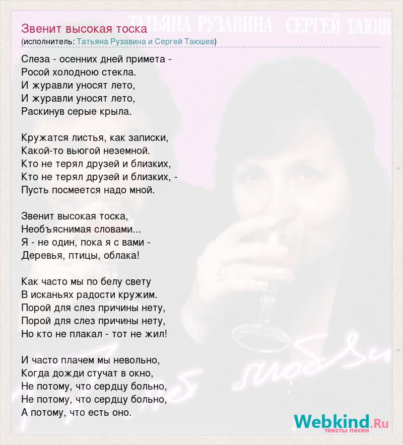 Слеза - осенних дней примета - Росой холодною стекла. И журавли уносят лето, И журавли уносят лето, Раскинув серые крыла. Кружатся листья, как записки, Какой-то вьюгой неземной. Кто не терял друзей и близких, Кто не терял друзей и близких, - Пусть посмеется надо мной. Звенит высокая тоска, Необъяснимая словами... Я - не один, пока я с вами - Деревья, птицы, облака! Как часто мы по белу свету В исканьях радости кружим. Порой для слез причины нету, Порой для слез причины нету, Но кто не плакал - тот не жил! И часто плачем мы невольно, Когда дожди стучат в окно, Не потому, что сердцу больно, Не потому, что сердцу больно, А потому, что есть оно.