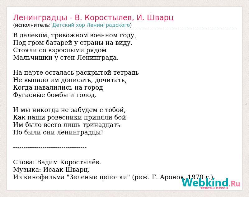 В далеком, тревожном военном году, Под гром батарей у страны на виду. Стояли со взрослыми рядом Мальчишки у стен Ленинграда. На парте осталась раскрытой тетрадь Не выпало им дописать, дочитать, Когда навалились на город Фугасные бомбы и голод. И мы никогда не забудем с тобой, Как наши ровесники приняли бой. Им было всего лишь тринадцать Но были они ленинградцы! ----------------------------------- Слова: Вадим Коростылёв. Музыка: Исаак Шварц. Из кинофильма "Зеленые цепочки" (реж. Г. Аронов, 1970 г.).