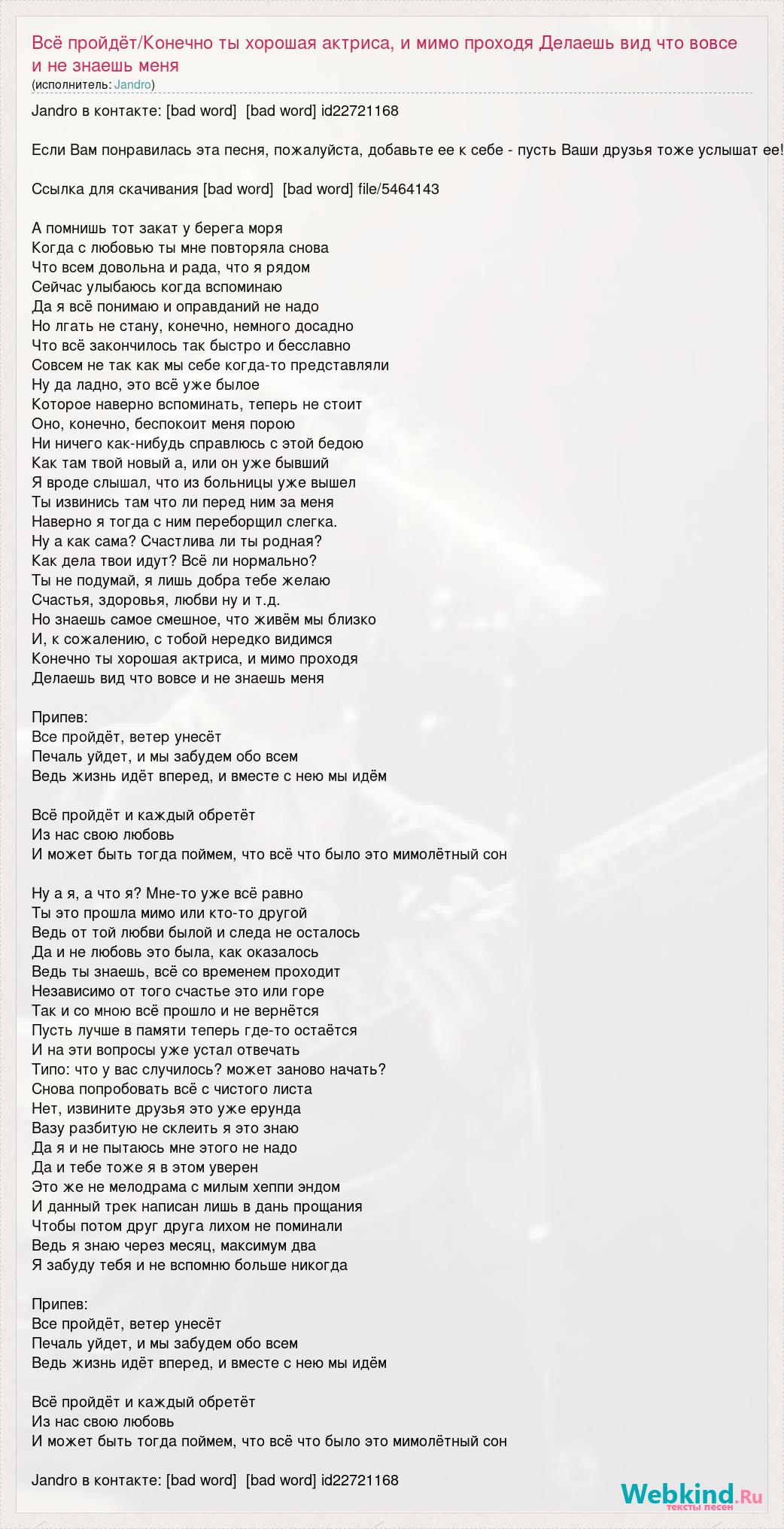 Jandro в контакте: [bad word] [bad word] id22721168 Если Вам понравилась эта песня, пожалуйста, добавьте ее к себе - пусть Ваши друзья тоже услышат ее! Ссылка для скачивания [bad word] [bad word] file/5464143 А помнишь тот закат у берега моря Когда с любовью ты мне повторяла снова Что всем довольна и рада, что я рядом Сейчас улыбаюсь когда вспоминаю Да я всё понимаю и оправданий не надо Но лгать не стану, конечно, немного досадно Что всё закончилось так быстро и бесславно Совсем не так как мы себе когда-то представляли Ну да ладно, это всё уже былое Которое наверно вспоминать, теперь не стоит Оно, конечно, беспокоит меня порою Ни ничего как-нибудь справлюсь с этой бедою Как там твой новый а, или он уже бывший Я вроде слышал, что из больницы уже вышел Ты извинись там что ли перед ним за меня Наверно я тогда с ним переборщил слегка. Ну а как сама? Счастлива ли ты родная? Как дела твои идут? Всё ли нормально? Ты не подумай, я лишь добра тебе желаю Счастья, здоровья, любви ну и т.д. Но знаешь самое смешное, что живём мы близко И, к сожалению, с тобой нередко видимся Конечно ты хорошая актриса, и мимо проходя Делаешь вид что вовсе и не знаешь меня Припев: Все пройдёт, ветер унесёт Печаль уйдет, и мы забудем обо всем Ведь жизнь идёт вперед, и вместе с нею мы идём Всё пройдёт и каждый обретёт Из нас свою любовь И может быть тогда поймем, что всё что было это мимолётный сон Ну а я, а что я? Мне-то уже всё равно Ты это прошла мимо или кто-то другой Ведь от той любви былой и следа не осталось Да и не любовь это была, как оказалось Ведь ты знаешь, всё со временем проходит Независимо от того счастье это или горе Так и со мною всё прошло и не вернётся Пусть лучше в памяти теперь где-то остаётся И на эти вопросы уже устал отвечать Типо: что у вас случилось? может заново начать? Снова попробовать всё с чистого листа Нет, извините друзья это уже ерунда Вазу разбитую не склеить я это знаю Да я и не пытаюсь мне этого не надо Да и тебе тоже я в этом уверен Это же не мелодрама с милым хеппи эндом И данный трек написан лишь в дань прощания Чтобы потом друг друга лихом не поминали Ведь я знаю через месяц, максимум два Я забуду тебя и не вспомню больше никогда Припев: Все пройдёт, ветер унесёт Печаль уйдет, и мы забудем обо всем Ведь жизнь идёт вперед, и вместе с нею мы идём Всё пройдёт и каждый обретёт Из нас свою любовь И может быть тогда поймем, что всё что было это мимолётный сон Jandro в контакте: [bad word] [bad word] id22721168