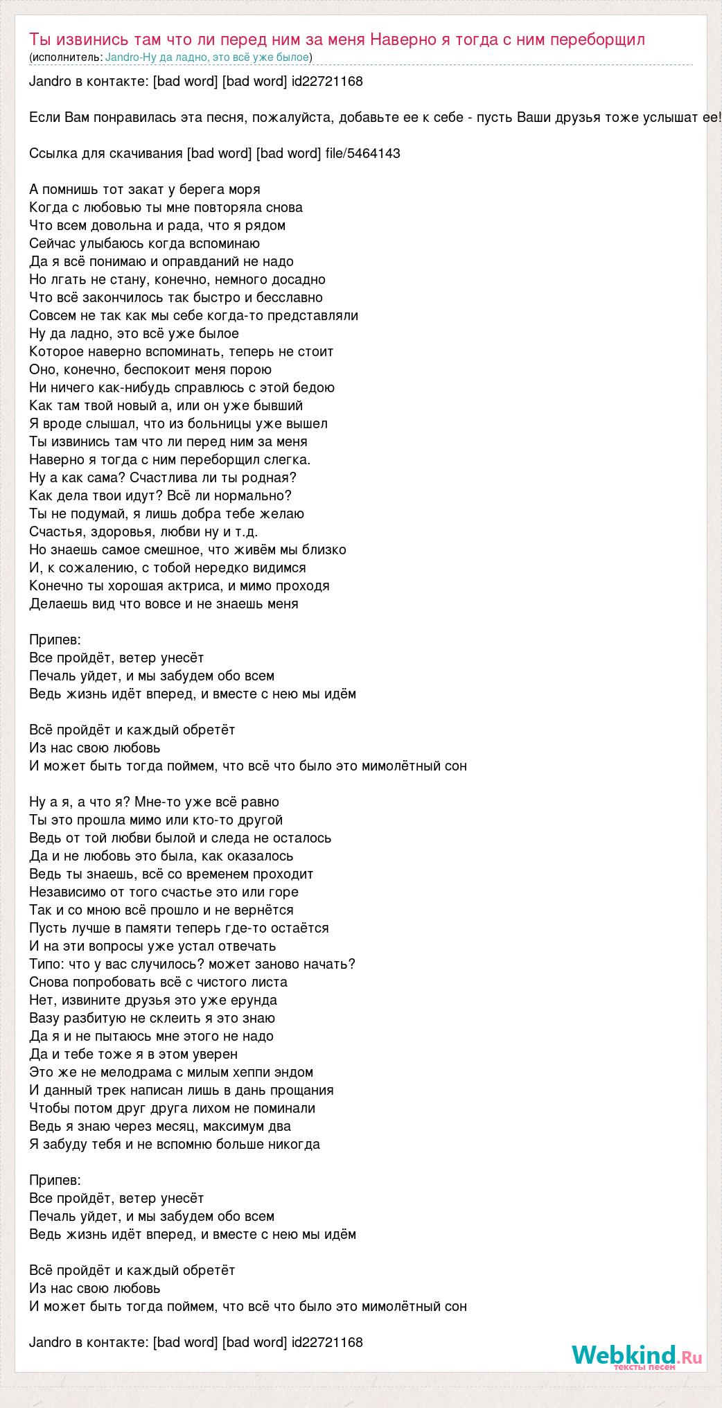 Jandro в контакте: [bad word] [bad word] id22721168 Если Вам понравилась эта песня, пожалуйста, добавьте ее к себе - пусть Ваши друзья тоже услышат ее! Ссылка для скачивания [bad word] [bad word] file/5464143 А помнишь тот закат у берега моря Когда с любовью ты мне повторяла снова Что всем довольна и рада, что я рядом Сейчас улыбаюсь когда вспоминаю Да я всё понимаю и оправданий не надо Но лгать не стану, конечно, немного досадно Что всё закончилось так быстро и бесславно Совсем не так как мы себе когда-то представляли Ну да ладно, это всё уже былое Которое наверно вспоминать, теперь не стоит Оно, конечно, беспокоит меня порою Ни ничего как-нибудь справлюсь с этой бедою Как там твой новый а, или он уже бывший Я вроде слышал, что из больницы уже вышел Ты извинись там что ли перед ним за меня Наверно я тогда с ним переборщил слегка. Ну а как сама? Счастлива ли ты родная? Как дела твои идут? Всё ли нормально? Ты не подумай, я лишь добра тебе желаю Счастья, здоровья, любви ну и т.д. Но знаешь самое смешное, что живём мы близко И, к сожалению, с тобой нередко видимся Конечно ты хорошая актриса, и мимо проходя Делаешь вид что вовсе и не знаешь меня Припев: Все пройдёт, ветер унесёт Печаль уйдет, и мы забудем обо всем Ведь жизнь идёт вперед, и вместе с нею мы идём Всё пройдёт и каждый обретёт Из нас свою любовь И может быть тогда поймем, что всё что было это мимолётный сон Ну а я, а что я? Мне-то уже всё равно Ты это прошла мимо или кто-то другой Ведь от той любви былой и следа не осталось Да и не любовь это была, как оказалось Ведь ты знаешь, всё со временем проходит Независимо от того счастье это или горе Так и со мною всё прошло и не вернётся Пусть лучше в памяти теперь где-то остаётся И на эти вопросы уже устал отвечать Типо: что у вас случилось? может заново начать? Снова попробовать всё с чистого листа Нет, извините друзья это уже ерунда Вазу разбитую не склеить я это знаю Да я и не пытаюсь мне этого не надо Да и тебе тоже я в этом уверен Это же не мелодрама с милым хеппи эндом И данный трек написан лишь в дань прощания Чтобы потом друг друга лихом не поминали Ведь я знаю через месяц, максимум два Я забуду тебя и не вспомню больше никогда Припев: Все пройдёт, ветер унесёт Печаль уйдет, и мы забудем обо всем Ведь жизнь идёт вперед, и вместе с нею мы идём Всё пройдёт и каждый обретёт Из нас свою любовь И может быть тогда поймем, что всё что было это мимолётный сон Jandro в контакте: [bad word] [bad word] id22721168