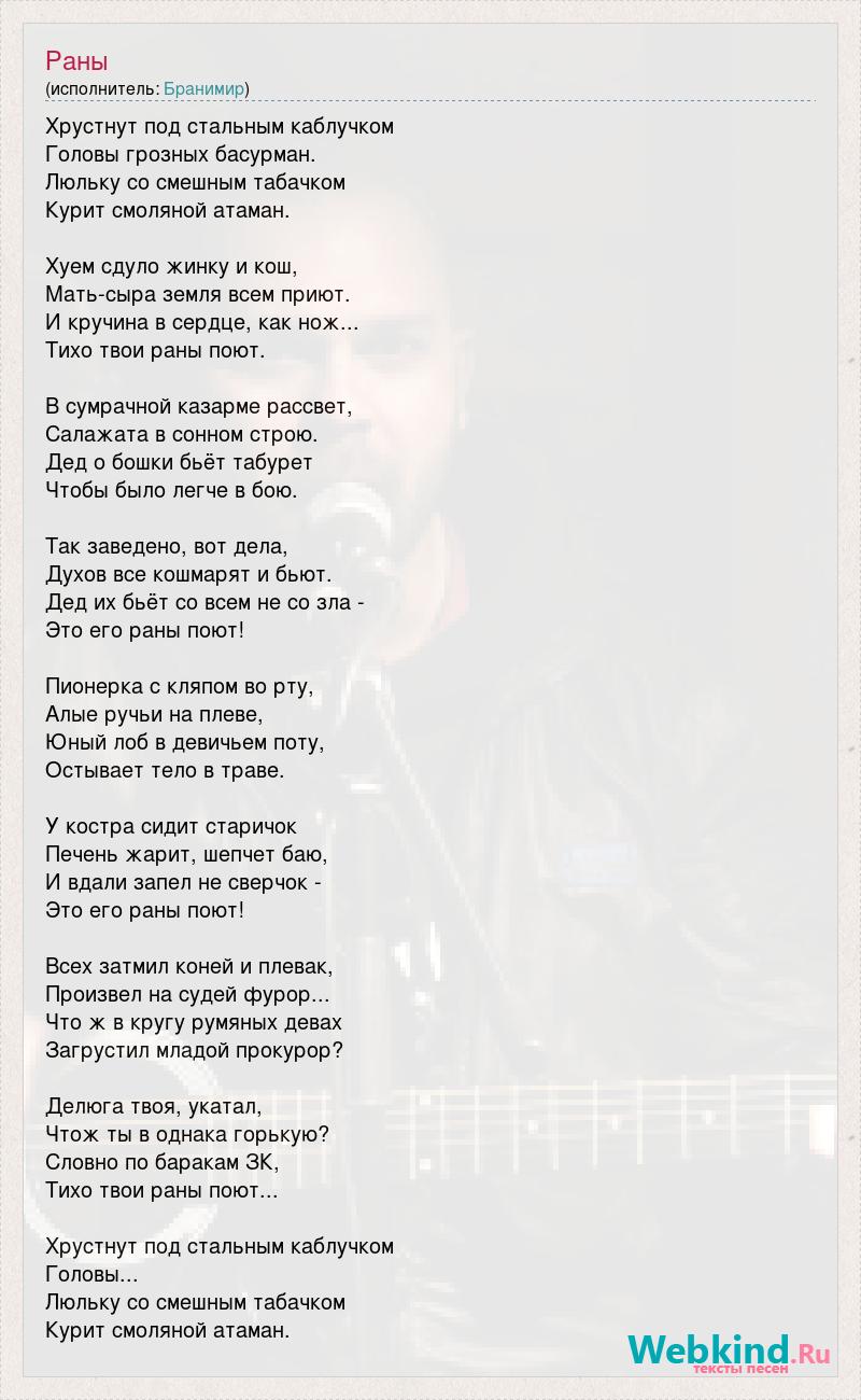 Хрустнут под стальным каблучком Головы грозных басурман. Люльку со смешным табачком Курит смоляной атаман. Хуем сдуло жинку и кош, Мать-сыра земля всем приют. И кручина в сердце, как нож... Тихо твои раны поют. В сумрачной казарме рассвет, Салажата в сонном строю. Дед о бошки бьёт табурет Чтобы было легче в бою. Так заведено, вот дела, Духов все кошмарят и бьют. Дед их бьёт со всем не со зла - Это его раны поют! Пионерка с кляпом во рту, Алые ручьи на плеве, Юный лоб в девичьем поту, Остывает тело в траве. У костра сидит старичок Печень жарит, шепчет баю, И вдали запел не сверчок - Это его раны поют! Всех затмил коней и плевак, Произвел на судей фурор... Что ж в кругу румяных девах Загрустил младой прокурор? Делюга твоя, укатал, Чтож ты в однака горькую? Словно по баракам ЗК, Тихо твои раны поют... Хрустнут под стальным каблучком Головы... Люльку со смешным табачком Курит смоляной атаман.
