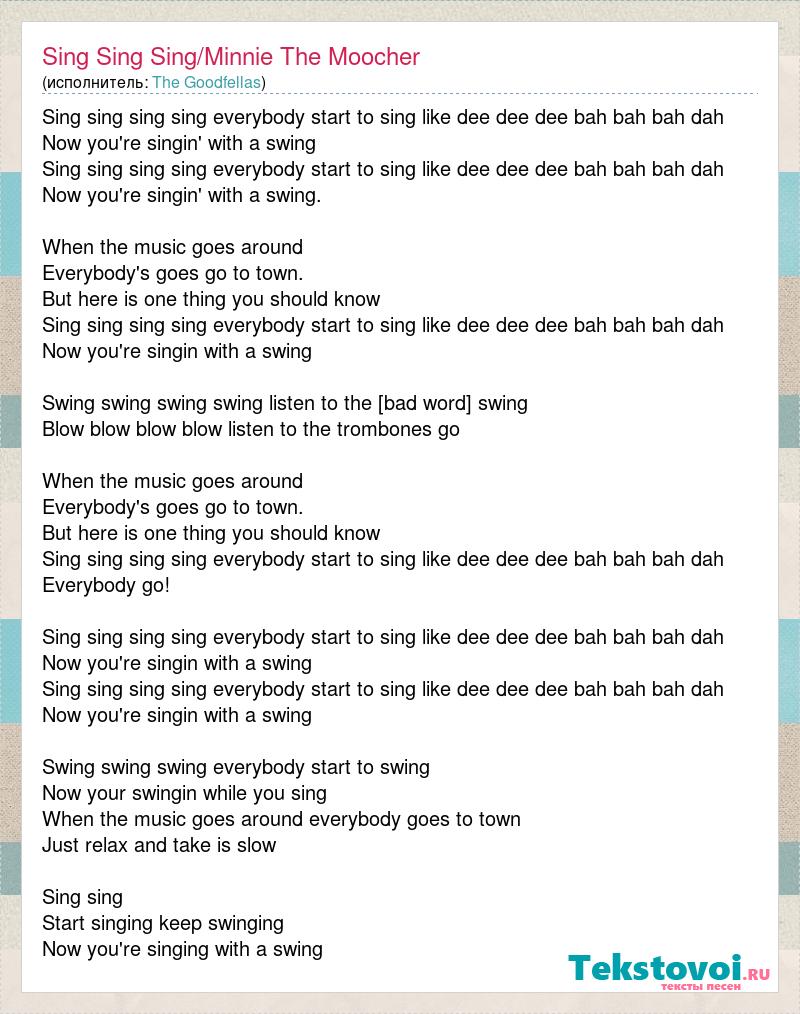 Sing sing sing sing everybody start to sing like dee dee dee bah bah bah dah Now you're singin' with a swing Sing sing sing sing everybody start to sing like dee dee dee bah bah bah dah Now you're singin' with a swing. When the music goes around Everybody's goes go to town. But here is one thing you should know Sing sing sing sing everybody start to sing like dee dee dee bah bah bah dah Now you're singin with a swing Swing swing swing swing listen to the trumpet swing Blow blow blow blow listen to the trombones go When the music goes around Everybody's goes go to town. But here is one thing you should know Sing sing sing sing everybody start to sing like dee dee dee bah bah bah dah Everybody go! Sing sing sing sing everybody start to sing like dee dee dee bah bah bah dah Now you're singin with a swing Sing sing sing sing everybody start to sing like dee dee dee bah bah bah dah Now you're singin with a swing Swing swing swing everybody start to swing Now your swingin while you sing When the music goes around everybody goes to town Just relax and take is slow Sing sing Start singing keep swinging Now you're singing with a swing