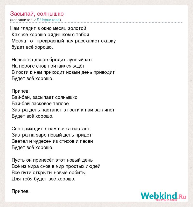 Нам глядит в окно месяц золотой Как же хорошо рядышком с тобой Месяц тот прекрасный нам расскажет сказку будет всё хорошо. Ночью на дворе бродит лунный кот На пороге снов притаился ждёт В гости к нам приходит новый день приводит Будет всё хорошо. Припев: Бай-бай, засыпает солнышко Бай-бай ласковое теплое Завтра день настанет в гости к нам заглянет Будет всё хорошо. Сон приходит к нам ночка настаёт Завтра на заре новый день придет Светел и чудесен из стихов и песен Будет всё хорошо. Пусть он принесёт этот новый день Всё из мира снов в мир простых людей Все пути открыты новые орбиты Для тебя будет всё хорошо. Припев.