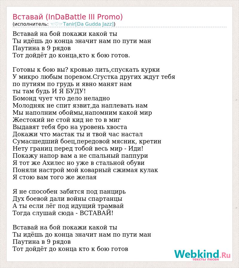 Вставай на бой покажи какой ты Ты идёшь до конца значит нам по пути ман Паутина в 9 рядов Тот дойдёт до конца,кто к бою готов. Готовы к бою вы? кровью лить,спускать курки У микро любым поревом.Сгустка других ждут тебя по путиям по грудь и явно манят нам ты там будь И Я БУДУ! Бомонд чует что дело неладно Молодняк не спит язвит,да наплевать нам Мы наполним обоймы,напомним какой мир Жестокий не стой кид не то в миг Выдавят тебя бро на уровень хвоста Докажи что мастак ты и твой час настал Сумасшедший боец,передовой мясник, кретин Нету границ перед тобой весь мир - Иди! Покажу напор вам а не спальный паппури Я тот же Ахилес но уже в стальной обуви Поняли настрой мой коварный сжимая кулак Я стою вам того же желая Я не способен забится под панцирь Дух боевой дали войны спартанцы А ты если лёг под идущий трамвай Тогда слушай сюда - ВСТАВАЙ! Вставай на бой покажи какой ты Ты идёшь до конца значит нам по пути ман Паутина в 9 рядов Тот дойдёт до конца кто к бою готов