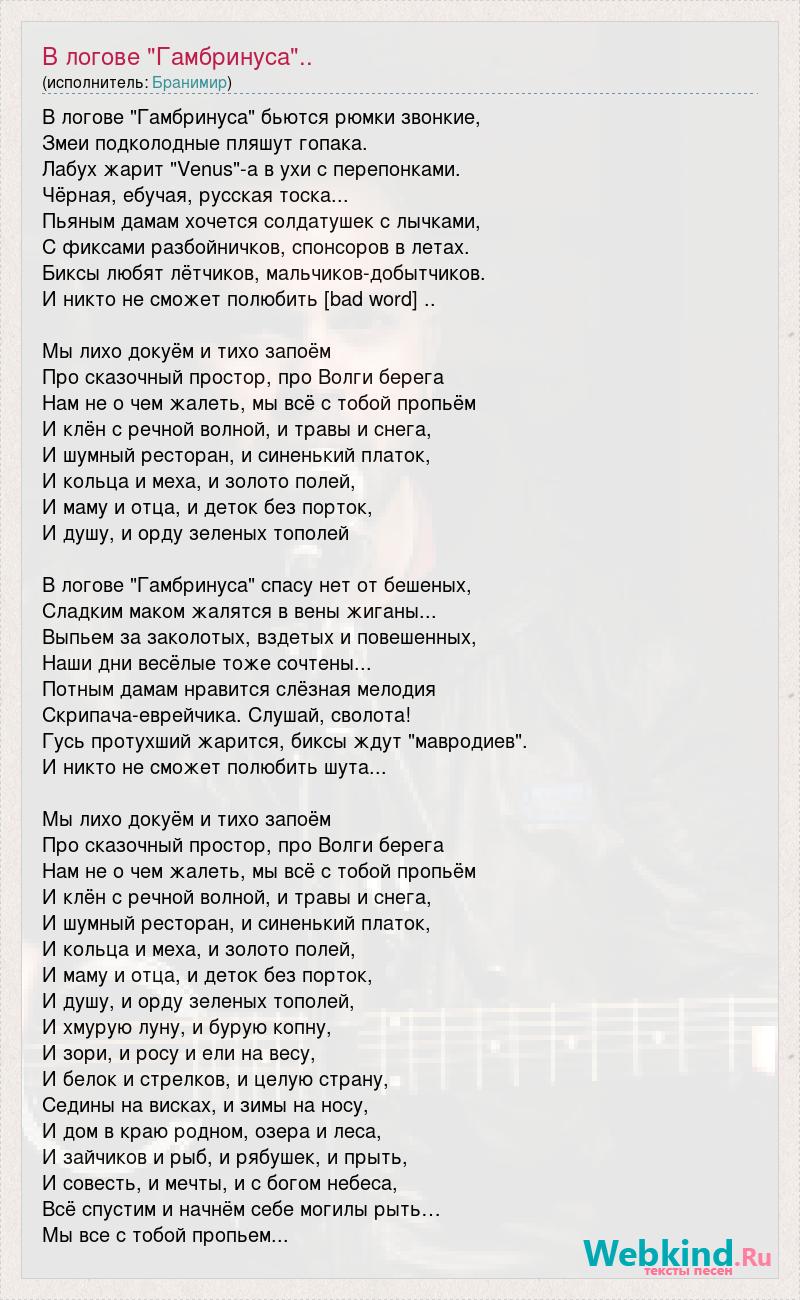 В логове "Гамбринуса" бьются рюмки звонкие, Змеи подколодные пляшут гопака. Лабух жарит "Venus"-a в ухи с перепонками. Чёрная, ебучая, русская тоска... Пьяным дамам хочется солдатушек с лычками, С фиксами разбойничков, спонсоров в летах. Биксы любят лётчиков, мальчиков-добытчиков. И никто не сможет полюбить [bad word] .. Мы лихо докуём и тихо запоём Про сказочный простор, про Волги берега Нам не о чем жалеть, мы всё с тобой пропьём И клён с речной волной, и травы и снега, И шумный ресторан, и синенький платок, И кольца и меха, и золото полей, И маму и отца, и деток без порток, И душу, и орду зеленых тополей В логове "Гамбринуса" спасу нет от бешеных, Сладким маком жалятся в вены жиганы... Выпьем за заколотых, вздетых и повешенных, Наши дни весёлые тоже сочтены... Потным дамам нравится слёзная мелодия Скрипача-еврейчика. Слушай, сволота! Гусь протухший жарится, биксы ждут "мавродиев". И никто не сможет полюбить шута... Мы лихо докуём и тихо запоём Про сказочный простор, про Волги берега Нам не о чем жалеть, мы всё с тобой пропьём И клён с речной волной, и травы и снега, И шумный ресторан, и синенький платок, И кольца и меха, и золото полей, И маму и отца, и деток без порток, И душу, и орду зеленых тополей, И хмурую луну, и бурую копну, И зори, и росу и ели на весу, И белок и стрелков, и целую страну, Седины на висках, и зимы на носу, И дом в краю родном, озера и леса, И зайчиков и рыб, и рябушек, и прыть, И совесть, и мечты, и с богом небеса, Всё спустим и начнём себе могилы рыть… Мы все с тобой пропьем...