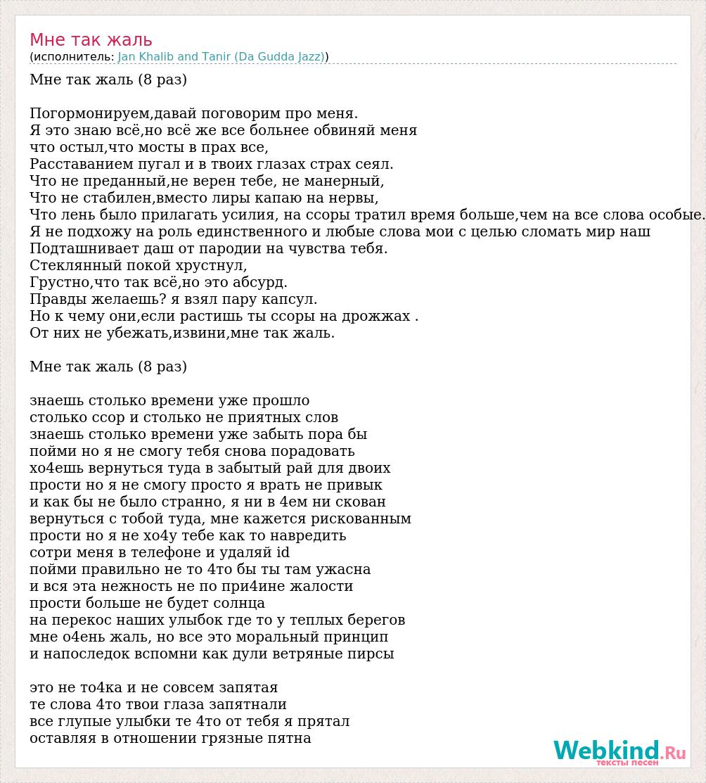 Мне так жаль (8 раз) Погормонируем,давай поговорим про меня. Я это знаю всё,но всё же все больнее обвиняй меня что остыл,что мосты в прах все, Расставанием пугал и в твоих глазах страх сеял. Что не преданный,не верен тебе, не манерный, Что не стабилен,вместо лиры капаю на нервы, Что лень было прилагать усилия, на ссоры тратил время больше,чем на все слова особые. Я не подхожу на роль единственного и любые слова мои с целью сломать мир наш Подташнивает даш от пародии на чувства тебя. Стеклянный покой хрустнул, Грустно,что так всё,но это абсурд. Правды желаешь? я взял пару капсул. Но к чему они,если растишь ты ссоры на дрожжах . От них не убежать,извини,мне так жаль. Мне так жаль (8 раз) знаешь столько времени уже прошло столько ссор и столько не приятных слов знаешь столько времени уже забыть пора бы пойми но я не смогу тебя снова порадовать хо4ешь вернуться туда в забытый рай для двоих прости но я не смогу просто я врать не привык и как бы не было странно, я ни в 4ем ни скован вернуться с тобой туда, мне кажется рискованным прости но я не хо4у тебе как то навредить сотри меня в телефоне и удаляй id пойми правильно не то 4то бы ты там ужасна и вся эта нежность не по при4ине жалости прости больше не будет солнца на перекос наших улыбок где то у теплых берегов мне о4ень жаль, но все это моральный принцип и напоследок вспомни как дули ветряные пирсы это не то4ка и не совсем запятая те слова 4то твои глаза запятнали все глупые улыбки те 4то от тебя я прятал оставляя в отношении грязные пятна