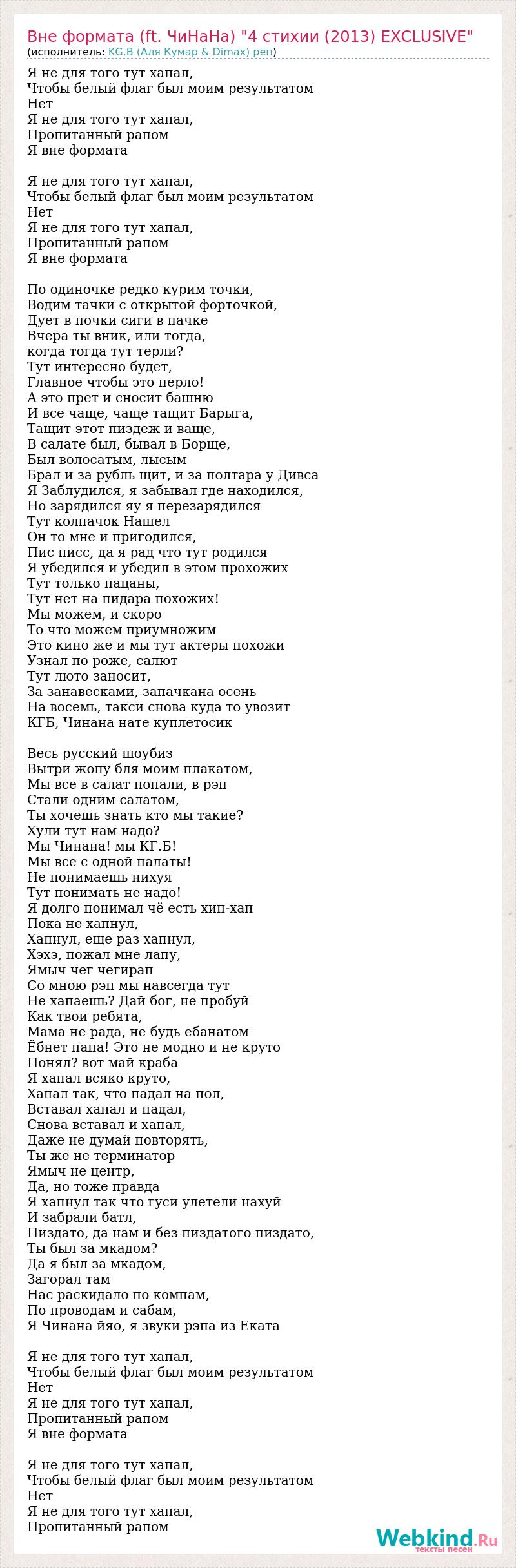 Я не для того тут хапал, Чтобы белый флаг был моим результатом Нет Я не для того тут хапал, Пропитанный рапом Я вне формата Я не для того тут хапал, Чтобы белый флаг был моим результатом Нет Я не для того тут хапал, Пропитанный рапом Я вне формата По одиночке редко курим точки, Водим тачки с открытой форточкой, Дует в почки сиги в пачке Вчера ты вник, или тогда, когда тогда тут терли? Тут интересно будет, Главное чтобы это перло! А это прет и сносит башню И все чаще, чаще тащит Барыга, Тащит этот пиздеж и ваще, В салате был, бывал в Борще, Был волосатым, лысым Брал и за рубль щит, и за полтара у Дивса Я Заблудился, я забывал где находился, Но зарядился яу я перезарядился Тут колпачок Нашел Он то мне и пригодился, Пис писс, да я рад что тут родился Я убедился и убедил в этом прохожих Тут только пацаны, Тут нет на пидара похожих! Мы можем, и скоро То что можем приумножим Это кино же и мы тут актеры похожи Узнал по роже, салют Тут люто заносит, За занавесками, запачкана осень На восемь, такси снова куда то увозит КГБ, Чинана нате куплетосик Весь русский шоубиз Вытри жопу бля моим плакатом, Мы все в салат попали, в рэп Стали одним салатом, Ты хочешь знать кто мы такие? Хули тут нам надо? Мы Чинана! мы КГ.Б! Мы все с одной палаты! Не понимаешь нихуя Тут понимать не надо! Я долго понимал чё есть хип-хап Пока не хапнул, Хапнул, еще раз хапнул, Хэхэ, пожал мне лапу, Ямыч чег чегирап Со мною рэп мы навсегда тут Не хапаешь? Дай бог, не пробуй Как твои ребята, Мама не рада, не будь ебанатом Ёбнет папа! Это не модно и не круто Понял? вот май краба Я хапал всяко круто, Хапал так, что падал на пол, Вставал хапал и падал, Снова вставал и хапал, Даже не думай повторять, Ты же не терминатор Ямыч не центр, Да, но тоже правда Я хапнул так что гуси улетели нахуй И забрали батл, Пиздато, да нам и без пиздатого пиздато, Ты был за мкадом? Да я был за мкадом, Загорал там Нас раскидало по компам, По проводам и сабам, Я Чинана йяо, я звуки рэпа из Еката Я не для того тут хапал, Чтобы белый флаг был моим результатом Нет Я не для того тут хапал, Пропитанный рапом Я вне формата Я не для того тут хапал, Чтобы белый флаг был моим результатом Нет Я не для того тут хапал, Пропитанный рапом