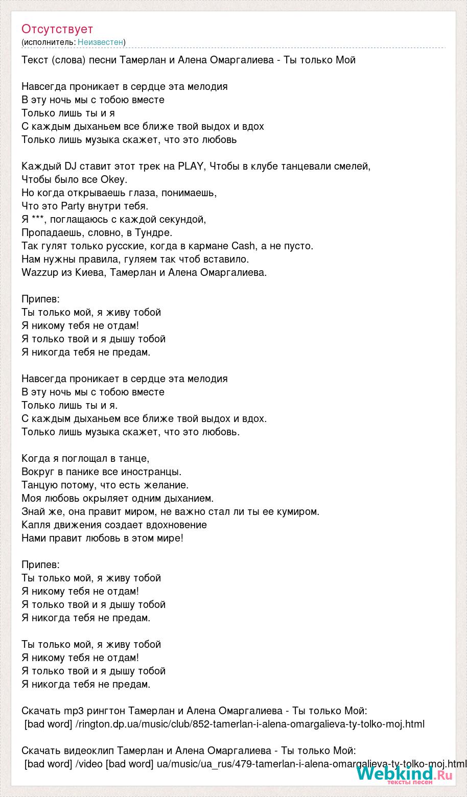 Текст (слова) песни Тамерлан и Алена Омаргалиева - Ты только Мой Навсегда проникает в сердце эта мелодия В эту ночь мы с тобою вместе Только лишь ты и я С каждым дыханьем все ближе твой выдох и вдох Только лишь музыка скажет, что это любовь Каждый DJ ставит этот трек на PLAY, Чтобы в клубе танцевали смелей, Чтобы было все Okey. Но когда открываешь глаза, понимаешь, Что это Party внутри тебя. Я ***, поглащаюсь с каждой секундой, Пропадаешь, словно, в Тундре. Так гулят только русские, когда в кармане Cash, а не пусто. Нам нужны правила, гуляем так чтоб вставило. Wazzup из Киева, Тамерлан и Алена Омаргалиева. Припев: Ты только мой, я живу тобой Я никому тебя не отдам! Я только твой и я дышу тобой Я никогда тебя не предам. Навсегда проникает в сердце эта мелодия В эту ночь мы с тобою вместе Только лишь ты и я. С каждым дыханьем все ближе твой выдох и вдох. Только лишь музыка скажет, что это любовь. Когда я поглощал в танце, Вокруг в панике все иностранцы. Танцую потому, что есть желание. Моя любовь окрыляет одним дыханием. Знай же, она правит миром, не важно стал ли ты ее кумиром. Капля движения создает вдохновение Нами правит любовь в этом мире! Припев: Ты только мой, я живу тобой Я никому тебя не отдам! Я только твой и я дышу тобой Я никогда тебя не предам. Ты только мой, я живу тобой Я никому тебя не отдам! Я только твой и я дышу тобой Я никогда тебя не предам. Скачать mp3 рингтон Тамерлан и Алена Омаргалиева - Ты только Мой: [bad word] /rington.dp.ua/music/club/852-tamerlan-i-alena-omargalieva-ty-tolko-moj.html Скачать видеоклип Тамерлан и Алена Омаргалиева - Ты только Мой: [bad word] /video [bad word] ua/music/ua_rus/479-tamerlan-i-alena-omargalieva-ty-tolko-moj.html