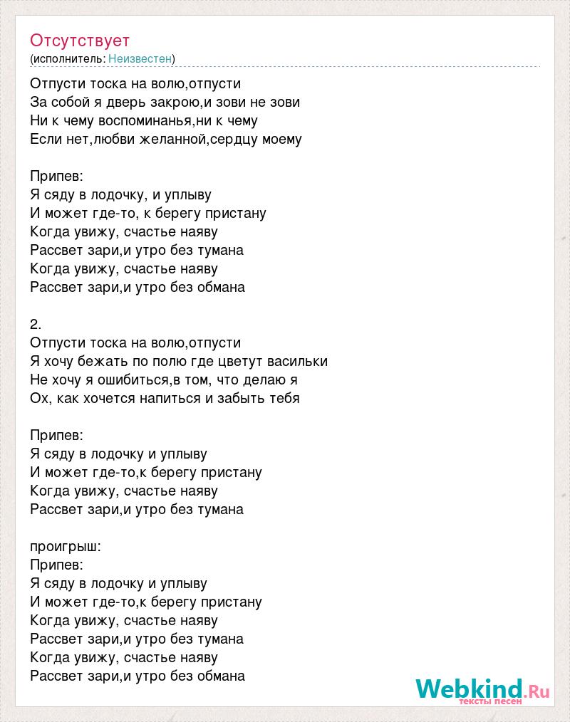 Отпусти тоска на волю,отпусти За собой я дверь закрою,и зови не зови Ни к чему воспоминанья,ни к чему Если нет,любви желанной,сердцу моему Припев: Я сяду в лодочку, и уплыву И может где-то, к берегу пристану Когда увижу, счастье наяву Рассвет зари,и утро без тумана Когда увижу, счастье наяву Рассвет зари,и утро без обмана 2. Отпусти тоска на волю,отпусти Я хочу бежать по полю где цветут васильки Не хочу я ошибиться,в том, что делаю я Ох, как хочется напиться и забыть тебя Припев: Я сяду в лодочку и уплыву И может где-то,к берегу пристану Когда увижу, счастье наяву Рассвет зари,и утро без тумана проигрыш: Припев: Я сяду в лодочку и уплыву И может где-то,к берегу пристану Когда увижу, счастье наяву Рассвет зари,и утро без тумана Когда увижу, счастье наяву Рассвет зари,и утро без обмана