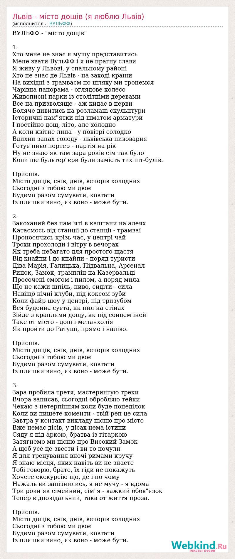 ВУЛЬФФ - "місто дощів" 1. Хто мене не знає я мушу представитись Мене звати ВульФФ і я не прагну слави Я живу у Львові, у спальному районі Хто не знає де Львів - на заході країни На вихідні з трамваєм по шляху ми тронемся Чарівна панорама - оглядове колесо Живописні парки із столітніми деревами Все на призволяще - аж кидає в нерви Боляче дивитись на розламані скульптури Історичні пам"ятки під шматом арматури І постійно дощ, літо, але холодно А коли квітне липа - у повітрі солодко Вдихни запах солоду - львівська пивоварня Готує пиво портер - партія на рік Ну не знаю як там зара років сім так було Коли ще бультер"єри були замість тих піт-булів. Приспів. Місто дощів, снів, днів, вечорів холодних Сьогодні з тобою ми двоє Будемо разом сумувати, ковтати Із пляшки вино, як воно - може бути. 2. Закоханий без пам"яті в каштани на алеях Катаємось від станції до станції - трамваї Проносячись крізь час, у центрі чай Трохи прохолоди і вітру в вечорах Як треба небагато для простого щастя Від кнайпи і до кнайпи - поряд туристи Діва Марія, Галицька, Підвальна, Арсенал Ринок, Замок, трамплін на Казервальді Просочені смогом і пилом, а поряд мила Що не кажи шпіль, пиво, сидіти - сила Навіщо нічні клуби, під коксом зуби Коли файр-шоу у центрі, під тризубом Вся буденна суєта, як пил на стінах Зійде з краплями дощу, як під сонцем іней Таке от місто - дощ і меланхолія Як пройти до Ратуші, прямо і наліво. Приспів. Місто дощів, снів, днів, вечорів холодних Сьогодні з тобою ми двоє Будемо разом сумувати, ковтати Із пляшки вино, як воно - може бути. 3. Зара пробила третя, мастерингую треки Вчора записав, сьогодні обробляю тейки Чекаю з нетерпінням коли буде понеділок Коли ви пишете коменти - твій реп це сила Завтра у контакт викладу пісню про місто Вже немає дісів, у дісах нема істини Сяду я під аркою, братва із гітаркою Затягнемо ми пісню про Високий Замок А щоб усе це звести і ви то почули Я для тренування вночі римами кручу Я знаю місця, яких навіть ви не знаєте Тобі говорю, брате, їх гіди не покажуть Хочете екскурсію що, де і по чому Нажаль ви запізнились, я не мучу - я вдома Три роки як сімейний, сім"я - важкий обов"язок Тепер відповідальний, така от життя проза. Приспів. Місто дощів, снів, днів, вечорів холодних Сьогодні з тобою ми двоє Будемо разом сумувати, ковтати Із пляшки вино, як воно - може бути.