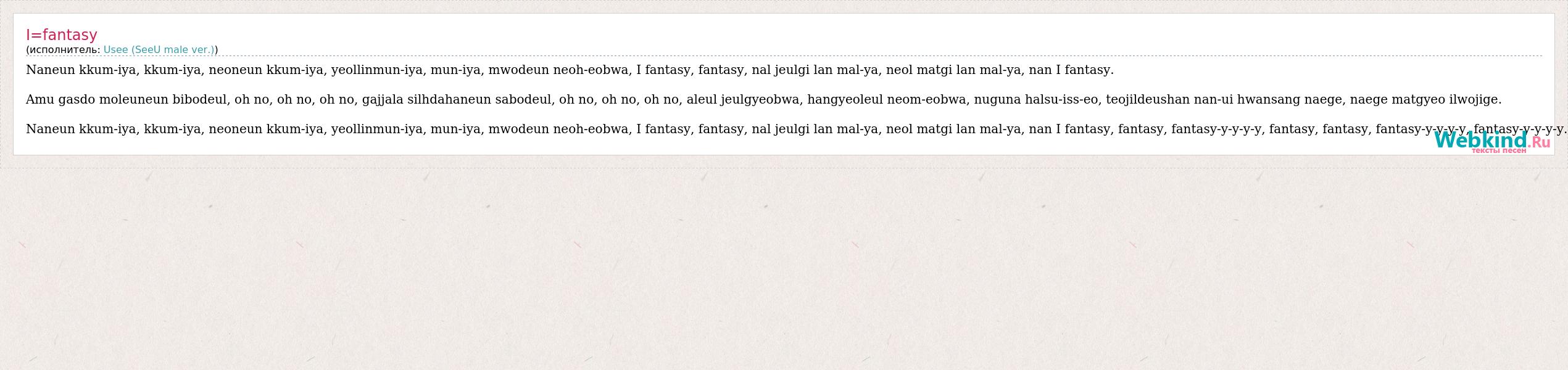 Naneun kkum-iya, kkum-iya, neoneun kkum-iya, yeollinmun-iya, mun-iya, mwodeun neoh-eobwa, I fantasy, fantasy, nal jeulgi lan mal-ya, neol matgi lan mal-ya, nan I fantasy. Amu gasdo moleuneun bibodeul, oh no, oh no, oh no, gajjala silhdahaneun sabodeul, oh no, oh no, oh no, aleul jeulgyeobwa, hangyeoleul neom-eobwa, nuguna halsu-iss-eo, teojildeushan nan-ui hwansang naege, naege matgyeo ilwojige. Naneun kkum-iya, kkum-iya, neoneun kkum-iya, yeollinmun-iya, mun-iya, mwodeun neoh-eobwa, I fantasy, fantasy, nal jeulgi lan mal-ya, neol matgi lan mal-ya, nan I fantasy, fantasy, fantasy-y-y-y-y, fantasy, fantasy, fantasy-y-y-y-y, fantasy-y-y-y-y.