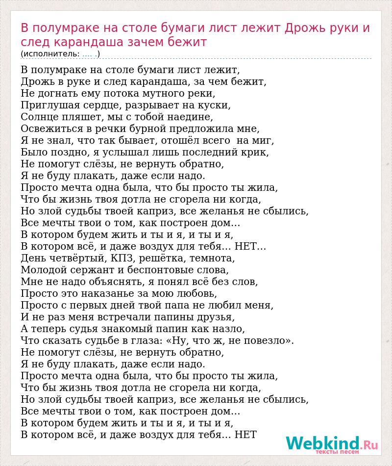 А как ты думаешь, о чем песня "В полумраке на столе бумаги лист лежит Дрожь руки и след карандаша зач" ?