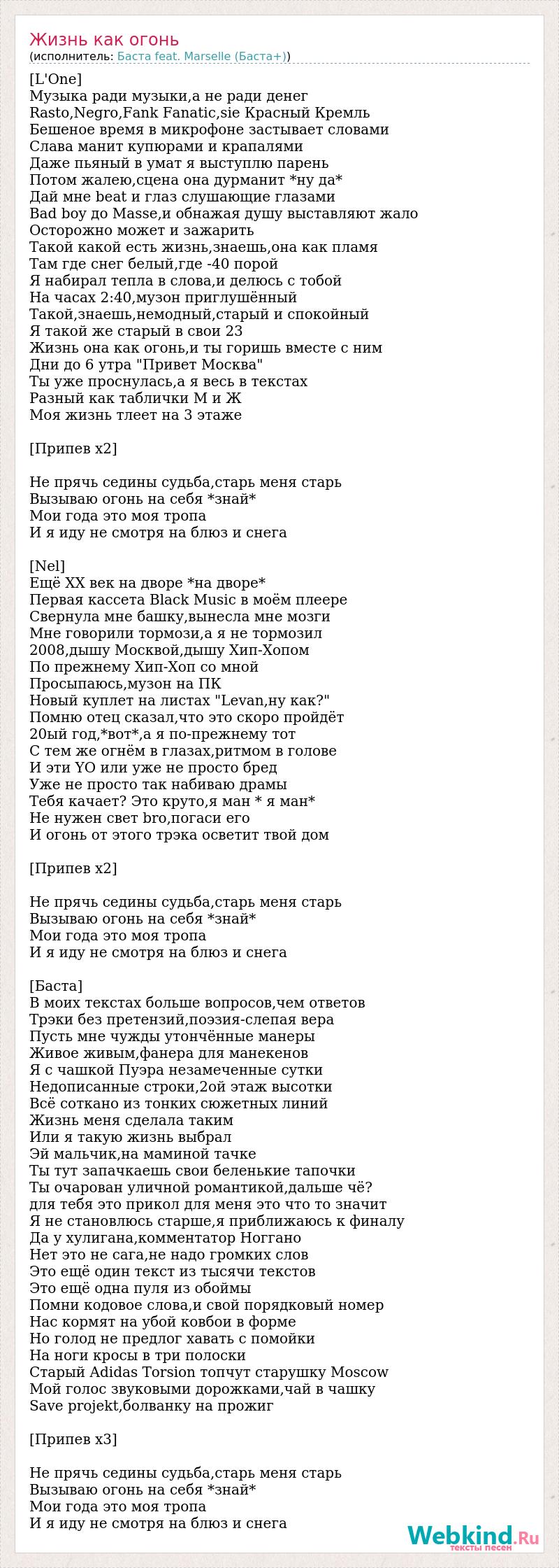 [L'One] Музыка ради музыки,а не ради денег Rasto,Negro,Fank Fanatic,sie Красный Кремль Бешеное время в микрофоне застывает словами Слава манит купюрами и крапалями Даже пьяный в умат я выступлю парень Потом жалею,сцена она дурманит *ну да* Дай мне beat и глаз слушающие глазами Bad boy до Masse,и обнажая душу выставляют жало Осторожно может и зажарить Такой какой есть жизнь,знаешь,она как пламя Там где снег белый,где -40 порой Я набирал тепла в слова,и делюсь с тобой На часах 2:40,музон приглушённый Такой,знаешь,немодный,старый и спокойный Я такой же старый в свои 23 Жизнь она как огонь,и ты горишь вместе с ним Дни до 6 утра "Привет Москва" Ты уже проснулась,а я весь в текстах Разный как таблички М и Ж Моя жизнь тлеет на 3 этаже [Припев х2] Не прячь седины судьба,старь меня старь Вызываю огонь на себя *знай* Мои года это моя тропа И я иду не смотря на блюз и снега [Nel] Ещё XX век на дворе *на дворе* Первая кассета Black Music в моём плеере Свернула мне башку,вынесла мне мозги Мне говорили тормози,а я не тормозил 2008,дышу Москвой,дышу Хип-Хопом По прежнему Хип-Хоп со мной Просыпаюсь,музон на ПК Новый куплет на листах "Levan,ну как?" Помню отец сказал,что это скоро пройдёт 20ый год,*вот*,а я по-прежнему тот С тем же огнём в глазах,ритмом в голове И эти YO или уже не просто бред Уже не просто так набиваю драмы Тебя качает? Это круто,я ман * я ман* Не нужен свет brо,погаси его И огонь от этого трэка осветит твой дом [Припев х2] Не прячь седины судьба,старь меня старь Вызываю огонь на себя *знай* Мои года это моя тропа И я иду не смотря на блюз и снега [Баста] В моих текстах больше вопросов,чем ответов Трэки без претензий,поэзия-слепая вера Пусть мне чужды утончённые манеры Живое живым,фанера для манекенов Я с чашкой Пуэра незамеченные сутки Недописанные строки,2ой этаж высотки Всё соткано из тонких сюжетных линий Жизнь меня сделала таким Или я такую жизнь выбрал Эй мальчик,на маминой тачке Ты тут запачкаешь свои беленькие тапочки Ты очарован уличной романтикой,дальше чё? для тебя это прикол для меня это что то значит Я не становлюсь старше,я приближаюсь к финалу Да у хулигана,комментатор Ноггано Нет это не сага,не надо громких слов Это ещё один текст из тысячи текстов Это ещё одна пуля из обоймы Помни кодовое слова,и свой порядковый номер Нас кормят на убой ковбои в форме Но голод не предлог хавать с помойки На ноги кросы в три полоски Старый Adidas Torsion топчут старушку Moscow Мой голос звуковыми дорожками,чай в чашку Save projekt,болванку на прожиг [Припев х3] Не прячь седины судьба,старь меня старь Вызываю огонь на себя *знай* Мои года это моя тропа И я иду не смотря на блюз и снега