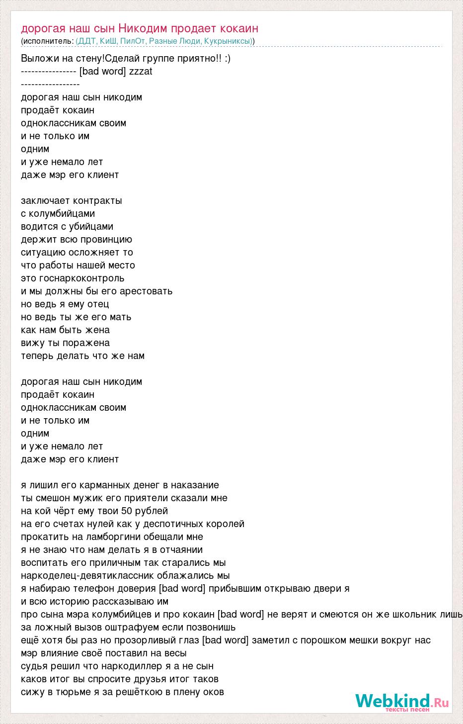 Главная→Исполнители→(ДДТ, КиШ, ПилОт, Разные Люди, Кукрыниксы)→Дорогая наш сын Никодим продает кокаин