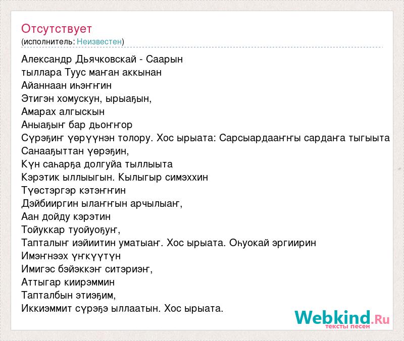 Александр Дьячковскай - Саарын тыллара Туус маҥан аккынан Айаннаан иһэҥҥин Этигэн хомускун, ырыаҕын, Амарах алгыскын Аныаҕыҥ бар дьоҥҥор Сүрэҕиҥ үөрүүнэн толору. Хос ырыата: Сарсыардааҥҥы сардаҥа тыгыыта Санааҕыттан үөрэҕин, Күн саһарҕа долгуйа тыллыыта Кэрэтик ыллыыгын. Кылыгыр симэххин Түөстэргэр кэтэҥҥин Дэйбииргин ылаҥҥын арчылыаҥ, Аан дойду кэрэтин Тойуккар туойуоҕуҥ, Тапталыҥ иэйиитин уматыаҥ. Хос ырыата. Оһуокай эргиирин Имэҥнээх үҥкүүтүн Имигэс бэйэккэҥ ситэриэҥ, Аттыгар киирэммин Тапталбын этиэҕим, Иккиэммит сүрэҕэ ыллаатын. Хос ырыата.
