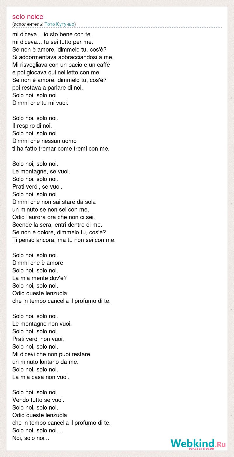 mi diceva... io sto bene con te. mi diceva... tu sei tutto per me. Se non è amore, dimmelo tu, cos'è? Si addormentava abbracciandosi a me. Mi risvegliava con un bacio e un caffè e poi giocava qui nel letto con me. Se non è amore, dimmelo tu, cos'è? poi restava a parlare di noi. Solo noi, solo noi. Dimmi che tu mi vuoi. Solo noi, solo noi. Il respiro di noi. Solo noi, solo noi. Dimmi che nessun uomo ti ha fatto tremar come tremi con me. Solo noi, solo noi. Le montagne, se vuoi. Solo noi, solo noi. Prati verdi, se vuoi. Solo noi, solo noi. Dimmi che non sai stare da sola un minuto se non sei con me. Odio l'aurora ora che non ci sei. Scende la sera, entri dentro di me. Se non è dolore, dimmelo tu, cos'è? Ti penso ancora, ma tu non sei con me. Solo noi, solo noi. Dimmi che è amore Solo noi, solo noi. La mia mente dov'è? Solo noi, solo noi. Odio queste lenzuola che in tempo cancella il profumo di te. Solo noi, solo noi. Le montagne non vuoi. Solo noi, solo noi. Prati verdi non vuoi. Solo noi, solo noi. Mi dicevi che non puoi restare un minuto lontano da me. Solo noi, solo noi. La mia casa non vuoi. Solo noi, solo noi. Vendo tutto se vuoi. Solo noi, solo noi. Odio queste lenzuola che in tempo cancella il profumo di te. Solo noi. solo noi... Noi, solo noi...