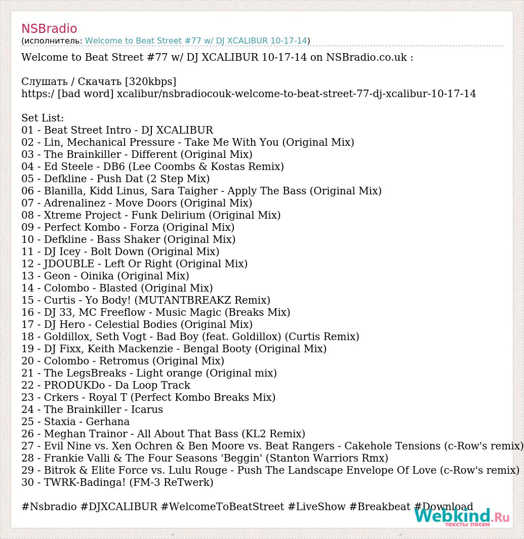 Welcome to Beat Street #77 w/ DJ XCALIBUR 10-17-14 on NSBradio.co.uk : Слушать / Скачать [320kbps] https:/ [bad word] xcalibur/nsbradiocouk-welcome-to-beat-street-77-dj-xcalibur-10-17-14 Set List: 01 - Beat Street Intro - DJ XCALIBUR 02 - Lin, Mechanical Pressure - Take Me With You (Original Mix) 03 - The Brainkiller - Different (Original Mix) 04 - Ed Steele - DB6 (Lee Coombs & Kostas Remix) 05 - Defkline - Push Dat (2 Step Mix) 06 - Blanilla, Kidd Linus, Sara Taigher - Apply The Bass (Original Mix) 07 - Adrenalinez - Move Doors (Original Mix) 08 - Xtreme Project - Funk Delirium (Original Mix) 09 - Perfect Kombo - Forza (Original Mix) 10 - Defkline - Bass Shaker (Original Mix) 11 - DJ Icey - Bolt Down (Original Mix) 12 - JDOUBLE - Left Or Right (Original Mix) 13 - Geon - Oinika (Original Mix) 14 - Colombo - Blasted (Original Mix) 15 - Curtis - Yo Body! (MUTANTBREAKZ Remix) 16 - DJ 33, MC Freeflow - Music Magic (Breaks Mix) 17 - DJ Hero - Celestial Bodies (Original Mix) 18 - Goldillox, Seth Vogt - Bad Boy (feat. Goldillox) (Curtis Remix) 19 - DJ Fixx, Keith Mackenzie - Bengal Booty (Original Mix) 20 - Colombo - Retromus (Original Mix) 21 - The LegsBreaks - Light orange (Original mix) 22 - PRODUKDo - Da Loop Track 23 - Crkers - Royal T (Perfect Kombo Breaks Mix) 24 - The Brainkiller - Icarus 25 - Staxia - Gerhana 26 - Meghan Trainor - All About That Bass (KL2 Remix) 27 - Evil Nine vs. Xen Ochren & Ben Moore vs. Beat Rangers - Cakehole Tensions (c-Row's remix) 28 - Frankie Valli & The Four Seasons 'Beggin' (Stanton Warriors Rmx) 29 - Bitrok & Elite Force vs. Lulu Rouge - Push The Landscape Envelope Of Love (c-Row's remix) 30 - TWRK-Badinga! (FM-3 ReTwerk) #Nsbradio #DJXCALIBUR #WelcomeToBeatStreet #LiveShow #Breakbeat #Download