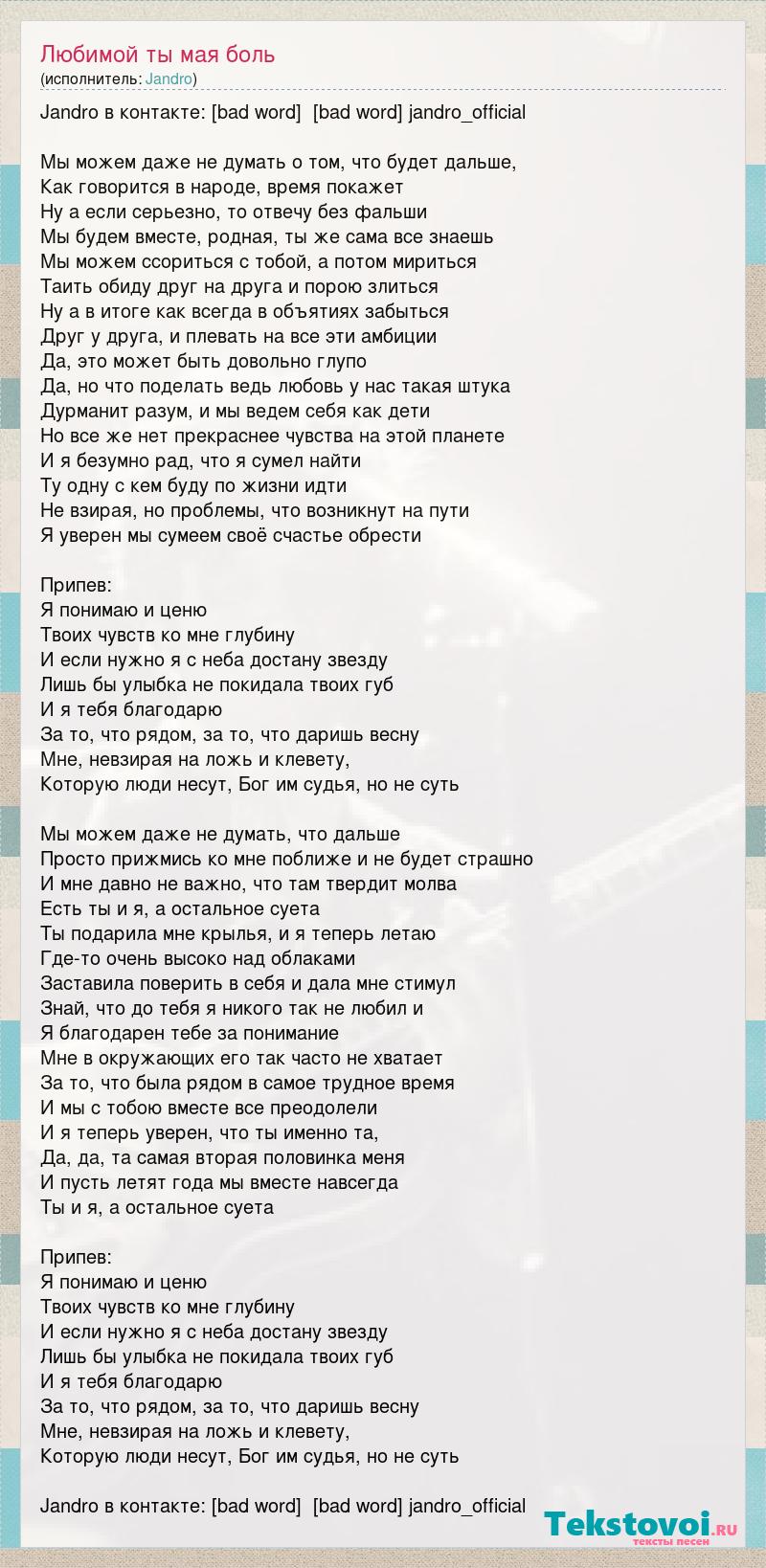 Jandro в контакте: [bad word] [bad word] jandro_official Мы можем даже не думать о том, что будет дальше, Как говорится в народе, время покажет Ну а если серьезно, то отвечу без фальши Мы будем вместе, родная, ты же сама все знаешь Мы можем ссориться с тобой, а потом мириться Таить обиду друг на друга и порою злиться Ну а в итоге как всегда в объятиях забыться Друг у друга, и плевать на все эти амбиции Да, это может быть довольно глупо Да, но что поделать ведь любовь у нас такая штука Дурманит разум, и мы ведем себя как дети Но все же нет прекраснее чувства на этой планете И я безумно рад, что я сумел найти Ту одну с кем буду по жизни идти Не взирая, но проблемы, что возникнут на пути Я уверен мы сумеем своё счастье обрести Припев: Я понимаю и ценю Твоих чувств ко мне глубину И если нужно я с неба достану звезду Лишь бы улыбка не покидала твоих губ И я тебя благодарю За то, что рядом, за то, что даришь весну Мне, невзирая на ложь и клевету, Которую люди несут, Бог им судья, но не суть Мы можем даже не думать, что дальше Просто прижмись ко мне поближе и не будет страшно И мне давно не важно, что там твердит молва Есть ты и я, а остальное суета Ты подарила мне крылья, и я теперь летаю Где-то очень высоко над облаками Заставила поверить в себя и дала мне стимул Знай, что до тебя я никого так не любил и Я благодарен тебе за понимание Мне в окружающих его так часто не хватает За то, что была рядом в самое трудное время И мы с тобою вместе все преодолели И я теперь уверен, что ты именно та, Да, да, та самая вторая половинка меня И пусть летят года мы вместе навсегда Ты и я, а остальное суета Припев: Я понимаю и ценю Твоих чувств ко мне глубину И если нужно я с неба достану звезду Лишь бы улыбка не покидала твоих губ И я тебя благодарю За то, что рядом, за то, что даришь весну Мне, невзирая на ложь и клевету, Которую люди несут, Бог им судья, но не суть Jandro в контакте: [bad word] [bad word] jandro_official