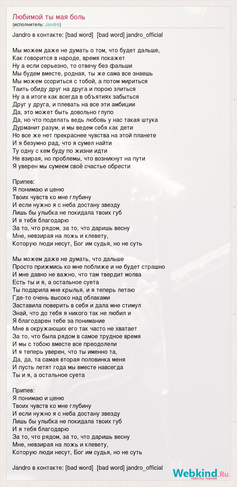 Jandro в контакте: [bad word] [bad word] jandro_official Мы можем даже не думать о том, что будет дальше, Как говорится в народе, время покажет Ну а если серьезно, то отвечу без фальши Мы будем вместе, родная, ты же сама все знаешь Мы можем ссориться с тобой, а потом мириться Таить обиду друг на друга и порою злиться Ну а в итоге как всегда в объятиях забыться Друг у друга, и плевать на все эти амбиции Да, это может быть довольно глупо Да, но что поделать ведь любовь у нас такая штука Дурманит разум, и мы ведем себя как дети Но все же нет прекраснее чувства на этой планете И я безумно рад, что я сумел найти Ту одну с кем буду по жизни идти Не взирая, но проблемы, что возникнут на пути Я уверен мы сумеем своё счастье обрести Припев: Я понимаю и ценю Твоих чувств ко мне глубину И если нужно я с неба достану звезду Лишь бы улыбка не покидала твоих губ И я тебя благодарю За то, что рядом, за то, что даришь весну Мне, невзирая на ложь и клевету, Которую люди несут, Бог им судья, но не суть Мы можем даже не думать, что дальше Просто прижмись ко мне поближе и не будет страшно И мне давно не важно, что там твердит молва Есть ты и я, а остальное суета Ты подарила мне крылья, и я теперь летаю Где-то очень высоко над облаками Заставила поверить в себя и дала мне стимул Знай, что до тебя я никого так не любил и Я благодарен тебе за понимание Мне в окружающих его так часто не хватает За то, что была рядом в самое трудное время И мы с тобою вместе все преодолели И я теперь уверен, что ты именно та, Да, да, та самая вторая половинка меня И пусть летят года мы вместе навсегда Ты и я, а остальное суета Припев: Я понимаю и ценю Твоих чувств ко мне глубину И если нужно я с неба достану звезду Лишь бы улыбка не покидала твоих губ И я тебя благодарю За то, что рядом, за то, что даришь весну Мне, невзирая на ложь и клевету, Которую люди несут, Бог им судья, но не суть Jandro в контакте: [bad word] [bad word] jandro_official