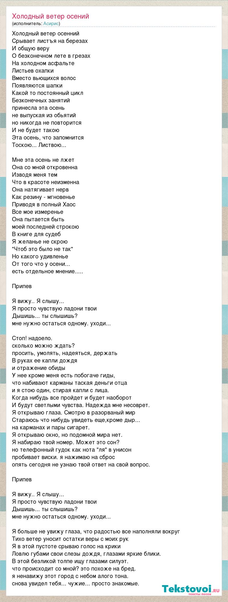 Холодный ветер осенний Срывает листъя на березах И общую веру О безконечном лете в грезах На холодном асфальте Листьев охапки Вместо вьющихся волос Появляются шапки Какой то постоянный цикл Безконечных занятий принесла эта осень не выпуская из обьятий но никогда не повторится И не будет такою Эта осень, что запомнится Тоскою... Листвою... Мне эта осень не лжет Она со мной откровенна Изводя меня тем Что в красоте неизменна Она натягивает нерв Как резину - мгновенье Приводя в полный Хаос Все мое измеренье Она пытается быть моей последней строкою В книге для судеб Я желанье не скрою "Чтоб это было не так" Но какого удивленье От того что у осени... есть отдельное мнение..... Припев Я вижу.. Я слышу... Я просто чувствую ладони твои Дышишь... ты слышишь? мне нужно остаться одному. уходи... Стоп! надоело. сколько можно ждать? просить, умолять, надеяться, держать В руках ее капли дождя и отражение обиды У нее кроме меня есть побогаче гиды, что набивают карманы таская деньги отца и я стою один, стирая капли с лица. Когда нибудь все пройдет и будет наоборот И будут светлыми чувства. Надежда мне несоврет. Я открываю глаза. Смотрю в разорваный мир Стараюсь что нибудь увидеть еще,кроме дыр... на карманах и пары сигарет. Я открываю окно, но подомной мира нет. Я набираю твой номер. Может это сон? но телефонный гудок как нота "ля" в унисон пробивает виски. я нажимаю на сброс опять сегодня не узнаю твой ответ на свой вопрос. Припев Я вижу.. Я слышу... Я просто чувствую ладони твои Дышишь... ты слышишь? мне нужно остаться одному. уходи... Я больше не увижу глаза, что радостью все наполняли вокруг Тихо ветер уносит остатки веры с моих рук Я в этой пустоте срываю голос на крики Ловлю губами свои слезы дождя, глазами яркие блики. В этой безликой толпе ищу глазами силуэт. что происходит со мной? это похоже на бред. я ненавижу этот город с небом алого тона. снова увидел тебя... чужие... просто знакомые.