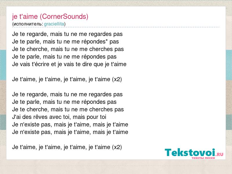 Je te regarde, mais tu ne me regardes pas Je te parle, mais tu ne me répondes* pas Je te cherche, mais tu ne me cherches pas Je te parle, mais tu ne me répondes pas Je vais t'écrire et je vais te dire que je t'aime Je t'aime, je t'aime, je t'aime, je t'aime (x2) Je te regarde, mais tu ne me regardes pas Je te parle, mais tu ne me répondes pas Je te cherche, mais tu ne me cherches pas J'ai des rêves avec toi, mais pour toi Je n'existe pas, mais je t'aime, mais je t'aime Je n'existe pas, mais je t'aime, mais je t'aime Je t'aime, je t'aime, je t'aime, je t'aime (x2)