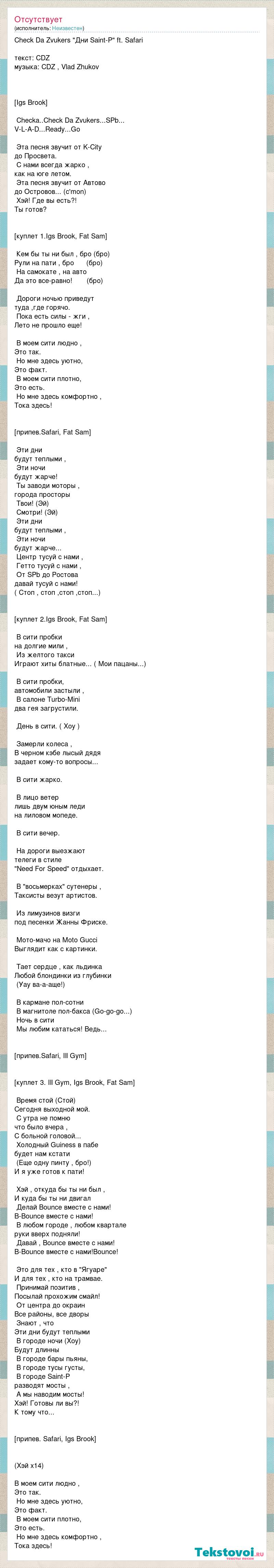 Check Da Zvukers "Дни Saint-P" ft. Safari текст: CDZ музыка: CDZ , Vlad Zhukov [Igs Brook] Checka..Check Da Zvukers...SPb... V-L-A-D...Ready...Go Эта песня звучит от K-City до Просвета. С нами всегда жарко , как на юге летом. Эта песня звучит от Автово до Островов... (c'mon) Хэй! Где вы есть?! Ты готов? [куплет 1.Igs Brook, Fat Sam] Кем бы ты ни был , бро (бро) Рули на пати , бро (бро) На самокате , на авто Да это все-равно! (бро) Дороги ночью приведут туда ,где горячо. Пока есть силы - жги , Лето не прошло еще! В моем сити людно , Это так. Но мне здесь уютно, Это факт. В моем сити плотно, Это есть. Но мне здесь комфортно , Тока здесь! [припев.Safari, Fat Sam] Эти дни будут теплыми , Эти ночи будут жарче! Ты заводи моторы , города просторы Твои! (Эй) Смотри! (Эй) Эти дни будут теплыми , Эти ночи будут жарче... Центр тусуй с нами , Гетто тусуй с нами , От SPb до Ростова давай тусуй с нами! ( Стоп , стоп ,стоп ,стоп...) [куплет 2.Igs Brook, Fat Sam] В сити пробки на долгие мили , Из желтого такси Играют хиты блатные... ( Мои пацаны...) В сити пробки, автомобили застыли , В салоне Turbo-Mini два гея загрустили. День в сити. ( Хоу ) Замерли колеса , В черном кэбе лысый дядя задает кому-то вопросы... В сити жарко. В лицо ветер лишь двум юным леди на лиловом мопеде. В сити вечер. На дороги выезжают телеги в стиле "Need For Speed" отдыхает. В "восьмерках" сутенеры , Таксисты везут артистов. Из лимузинов визги под песенки Жанны Фриске. Мото-мачо на Moto Gucci Выглядит как с картинки. Тает сердце , как льдинка Любой блондинки из глубинки (Уау ва-а-аще!) В кармане пол-сотни В магнитоле пол-бакса (Go-go-go...) Ночь в сити Мы любим кататься! Ведь... [припев.Safari, Ill Gym] [куплет 3. Ill Gym, Igs Brook, Fat Sam] Время стой (Стой) Сегодня выходной мой. С утра не помню что было вчера , С больной головой... Холодный Guiness в пабе будет нам кстати (Еще одну пинту , бро!) И я уже готов к пати! Хэй , откуда бы ты ни был , И куда бы ты ни двигал Делай Bounce вместе с нами! B-Bounce вместе с нами! В любом городе , любом квартале руки вверх подняли! Давай , Bounce вместе с нами! B-Bounce вместе с нами!Bounce! Это для тех , кто в "Ягуаре" И для тех , кто на трамвае. Принимай позитив , Посылай прохожим смайл! От центра до окраин Все районы, все дворы Знают , что Эти дни будут теплыми В городе ночи (Хоу) Будут длинны В городе бары пьяны, В городе тусы густы, В городе Saint-P разводят мосты , А мы наводим мосты! Хэй! Готовы ли вы?! К тому что... [припев. Safari, Igs Brook] (Хэй x14) В моем сити людно , Это так. Но мне здесь уютно, Это факт. В моем сити плотно, Это есть. Но мне здесь комфортно , Тока здесь!