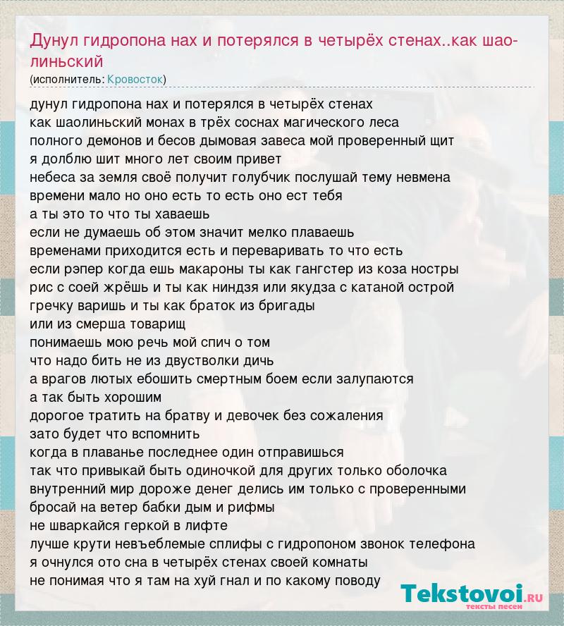 дунул гидропона нах и потерялся в четырёх стенах как шаолиньский монах в трёх соснах магического леса полного демонов и бесов дымовая завеса мой проверенный щит я долблю шит много лет своим привет небеса за земля своё получит голубчик послушай тему невмена времени мало но оно есть то есть оно ест тебя а ты это то что ты хаваешь если не думаешь об этом значит мелко плаваешь временами приходится есть и переваривать то что есть если рэпер когда ешь макароны ты как гангстер из коза ностры рис с соей жрёшь и ты как ниндзя или якудза с катаной острой гречку варишь и ты как браток из бригады или из смерша товарищ понимаешь мою речь мой спич о том что надо бить не из двустволки дичь а врагов лютых ебошить смертным боем если залупаются а так быть хорошим дорогое тратить на братву и девочек без сожаления зато будет что вспомнить когда в плаванье последнее один отправишься так что привыкай быть одиночкой для других только оболочка внутренний мир дороже денег делись им только с проверенными бросай на ветер бабки дым и рифмы не шваркайся геркой в лифте лучше крути невъеблемые сплифы с гидропоном звонок телефона я очнулся ото сна в четырёх стенах своей комнаты не понимая что я там на хуй гнал и по какому поводу