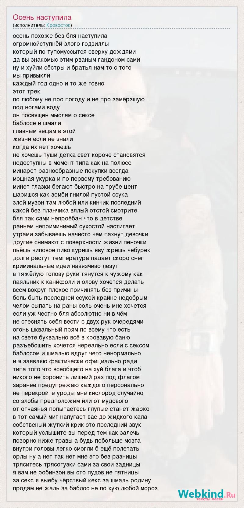 осень похоже без бля наступила огромнойступнёй злого годзиллы который по тупомуссытся сверху дождями да вы знакомыс этим рваным гандоном сами ну и хуйли сёстры и братья нам то с того мы привыкли каждый год одно и то же говно этот трек по любому не про погоду и не про замёрзшую под ногами воду он посвящён мыслям о сексе баблосе и шмали главным вещам в этой жизни если не знали когда их нет хочешь не хочешь туши детка свет короче становятся недоступны в момент типа как на полюсе минарет разнообразные покупки всегда мощная укурка и по первому требованию минет глазки бегают быстро на трубе цент шаришся как зомби гнилой пустой ссука злой музон там любой или кинчик последний какой без планчика вялый отстой смотрите бля так сами непроёбан что в детстве раннем неприминимый сухостой настигает утрами забываешь начисто чем пахнут девочки другие снимают с поверхности жизни пеночки пьёшь чиповое пиво куришь яву жрёшь чебурек долги растут температура падает скоро снег криминальные идеи навязчиво лезут в тяжёлую голову руки тянутся к чужому как паяльник к канифоли и олову хочется делать всем вокруг плохое причинять без причины боль быть последней ссукой крайне недобрым челом сыпать на раны соль очень мне хочется если уж честно бля абсолютно ни в чём не стеснять себя вести с двух рук очередями огонь шквальный прям по всему что есть на свете буквально всё в кровавую баню разъебошить хочется нереально если с сексом баблосом и шмалью вдруг чего ненормально и я заявляю фактически официально ради типа того что всеобщего на хуй блага и чтоб никого не хоронить лишний раз под флагом заранее предупрежаю каждого персонально не перекройте уроды мне кислород случайно со злобы предположим или от мудового от отчаянья попытаетесь глупые станет жарко в тот самый миг напугает вас до жидкого кала собственый жуткий крик это последний звук который услышите вы перед тем как залечь позорно ниже травы а будь побольше мозга внутри головы легко смогли б ещё полетать орлы ну а нет так нет мне это без разницы тряситесь трясогузки сами за свои задницы я вам не робинзон вы сто пудов не пятницы за секс я выебу чёрствый кекс за шмаль родину продам не жаль за баблос не по хую любой мороз