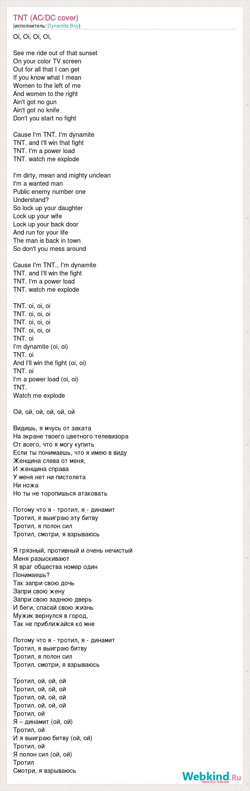 Oi, Oi, Oi, Oi, See me ride out of that sunset On your color TV screen Out for all that I can get If you know what I mean Women to the left of me And women to the right Ain't got no gun Ain't got no knife Don't you start no fight Cause I'm TNT. I'm dynamite TNT. and I'll win that fight TNT. I'm a power load TNT. watch me explode I'm dirty, mean and mighty unclean I'm a wanted man Public enemy number one Understand? So lock up your daughter Lock up your wife Lock up your back door And run for your life The man is back in town So don't you mess around Cause I'm TNT., I'm dynamite TNT. and I'll win the fight TNT. I'm a power load TNT. watch me explode TNT. oi, oi, oi TNT. oi, oi, oi TNT. oi, oi, oi TNT. oi, oi, oi TNT. oi I'm dynamite (oi, oi) TNT. oi And I'll win the fight (oi, oi) TNT. oi I'm a power load (oi, oi) TNT. Watch me explode Ой, ой, ой, ой, ой, ой Видишь, я мчусь от заката На экране твоего цветного телевизора От всего, что я могу купить Если ты понимаешь, что я имею в виду Женщина слева от меня, И женщина справа У меня нет ни пистолета Ни ножа Но ты не торопишься атаковать Потому что я - тротил, я - динамит Тротил, я выиграю эту битву Тротил, я полон сил Тротил, смотри, я взрываюсь Я грязный, противный и очень нечистый Меня разыскивают Я враг общества номер один Понимаешь? Так запри свою дочь Запри свою жену Запри свою заднюю дверь И беги, спасай свою жизнь Мужик вернулся в город, Так не приближайся ко мне Потому что я - тротил, я - динамит Тротил, я выиграю битву Тротил, я полон сил Тротил, смотри, я взрываюсь Тротил, ой, ой, ой Тротил, ой, ой, ой Тротил, ой, ой, ой Тротил, ой, ой, ой Тротил, ой Я – динамит (ой, ой) Тротил, ой И я выиграю битву (ой, ой) Тротил, ой Я полон сил (ой, ой) Тротил Смотри, я взрываюсь
