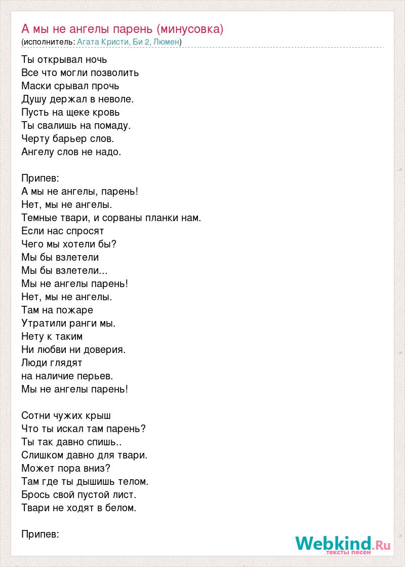 Ты открывал ночь Все что могли позволить Маски срывал прочь Душу держал в неволе. Пусть на щеке кровь Ты свалишь на помаду. Черту барьер слов. Ангелу слов не надо. Припев: А мы не ангелы, парень! Нет, мы не ангелы. Темные твари, и сорваны планки нам. Если нас спросят Чего мы хотели бы? Мы бы взлетели Мы бы взлетели... Мы не ангелы парень! Нет, мы не ангелы. Там на пожаре Утратили ранги мы. Нету к таким Ни любви ни доверия. Люди глядят на наличие перьев. Мы не ангелы парень! Сотни чужих крыш Что ты искал там парень? Ты так давно спишь.. Слишком давно для твари. Может пора вниз? Там где ты дышишь телом. Брось свой пустой лист. Твари не ходят в белом. Припев: