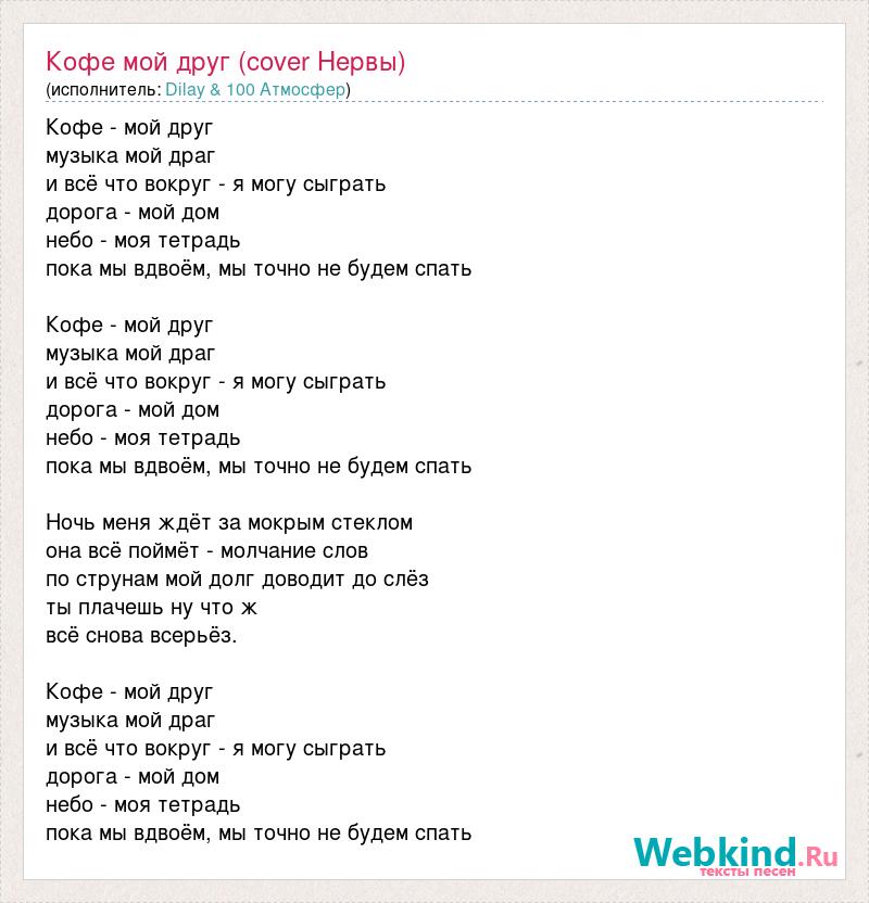 Кофе - мой друг музыка мой драг и всё что вокруг - я могу сыграть дорога - мой дом небо - моя тетрадь пока мы вдвоём, мы точно не будем спать Кофе - мой друг музыка мой драг и всё что вокруг - я могу сыграть дорога - мой дом небо - моя тетрадь пока мы вдвоём, мы точно не будем спать Ночь меня ждёт за мокрым стеклом она всё поймёт - молчание слов по струнам мой долг доводит до слёз ты плачешь ну что ж всё снова всерьёз. Кофе - мой друг музыка мой драг и всё что вокруг - я могу сыграть дорога - мой дом небо - моя тетрадь пока мы вдвоём, мы точно не будем спать