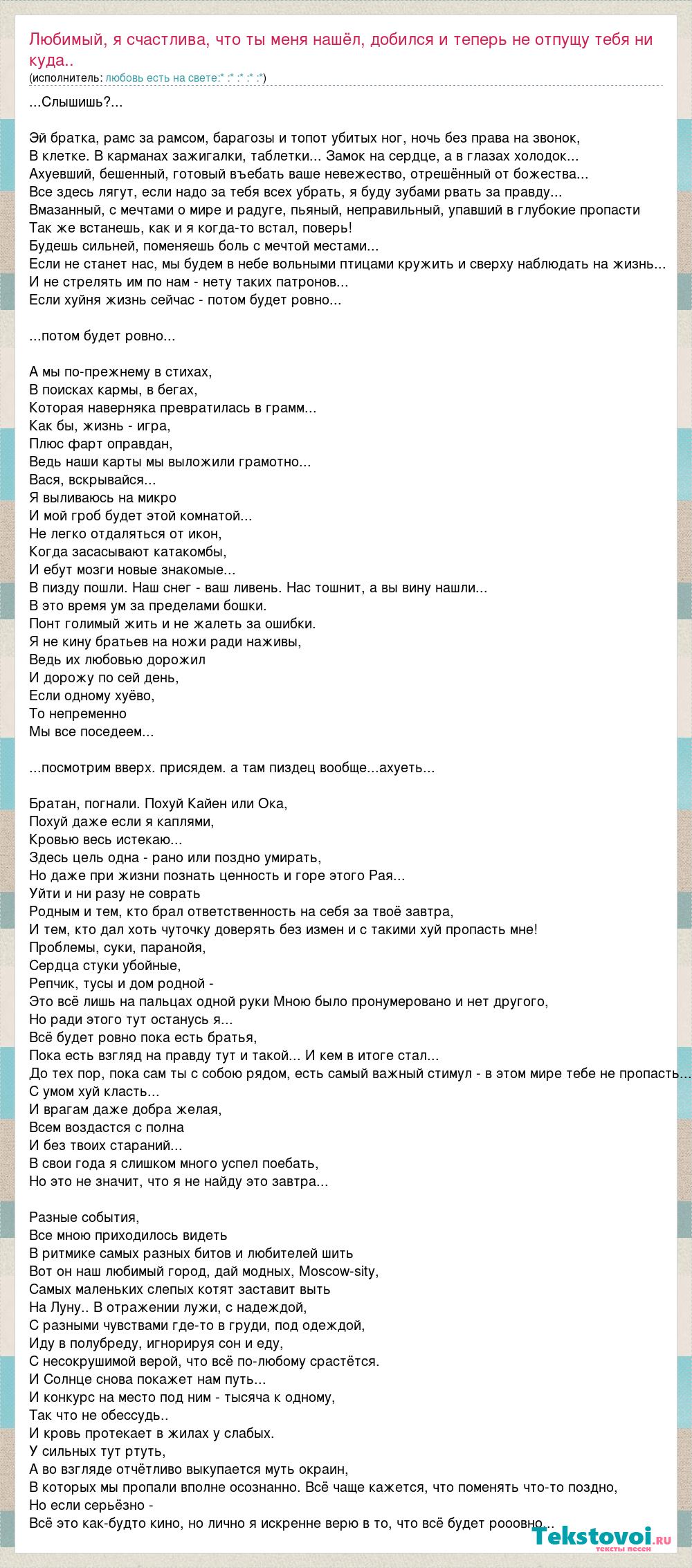 ...Слышишь?... Эй братка, рамс за рамсом, барагозы и топот убитых ног, ночь без права на звонок, В клетке. В карманах зажигалки, таблетки... Замок на сердце, а в глазах холодок... Ахуевший, бешенный, готовый въебать ваше невежество, отрешённый от божества... Все здесь лягут, если надо за тебя всех убрать, я буду зубами рвать за правду... Вмазанный, с мечтами о мире и радуге, пьяный, неправильный, упавший в глубокие пропасти Так же встанешь, как и я когда-то встал, поверь! Будешь сильней, поменяешь боль с мечтой местами... Если не станет нас, мы будем в небе вольными птицами кружить и сверху наблюдать на жизнь... И не стрелять им по нам - нету таких патронов... Если хуйня жизнь сейчас - потом будет ровно... ...потом будет ровно... А мы по-прежнему в стихах, В поисках кармы, в бегах, Которая наверняка превратилась в грамм... Как бы, жизнь - игра, Плюс фарт оправдан, Ведь наши карты мы выложили грамотно... Вася, вскрывайся... Я выливаюсь на микро И мой гроб будет этой комнатой... Не легко отдаляться от икон, Когда засасывают катакомбы, И ебут мозги новые знакомые... В пизду пошли. Наш снег - ваш ливень. Нас тошнит, а вы вину нашли... В это время ум за пределами бошки. Понт голимый жить и не жалеть за ошибки. Я не кину братьев на ножи ради наживы, Ведь их любовью дорожил И дорожу по сей день, Если одному хуёво, То непременно Мы все поседеем... ...посмотрим вверх. присядем. а там пиздец вообще...ахуеть... Братан, погнали. Похуй Кайен или Ока, Похуй даже если я каплями, Кровью весь истекаю... Здесь цель одна - рано или поздно умирать, Но даже при жизни познать ценность и горе этого Рая... Уйти и ни разу не соврать Родным и тем, кто брал ответственность на себя за твоё завтра, И тем, кто дал хоть чуточку доверять без измен и с такими хуй пропасть мне! Проблемы, суки, паранойя, Сердца стуки убойные, Репчик, тусы и дом родной - Это всё лишь на пальцах одной руки Мною было пронумеровано и нет другого, Но ради этого тут останусь я... Всё будет ровно пока есть братья, Пока есть взгляд на правду тут и такой... И кем в итоге стал... До тех пор, пока сам ты с собою рядом, есть самый важный стимул - в этом мире тебе не пропасть... С умом хуй класть... И врагам даже добра желая, Всем воздастся с полна И без твоих стараний... В свои года я слишком много успел поебать, Но это не значит, что я не найду это завтра... Разные события, Все мною приходилось видеть В ритмике самых разных битов и любителей шить Вот он наш любимый город, дай модных, Moscow-sity, Самых маленьких слепых котят заставит выть На Луну.. В отражении лужи, с надеждой, С разными чувствами где-то в груди, под одеждой, Иду в полубреду, игнорируя сон и еду, С несокрушимой верой, что всё по-любому срастётся. И Солнце снова покажет нам путь... И конкурс на место под ним - тысяча к одному, Так что не обессудь.. И кровь протекает в жилах у слабых. У сильных тут ртуть, А во взгляде отчётливо выкупается муть окраин, В которых мы пропали вполне осознанно. Всё чаще кажется, что поменять что-то поздно, Но если серьёзно - Всё это как-будто кино, но лично я искренне верю в то, что всё будет рооовно...