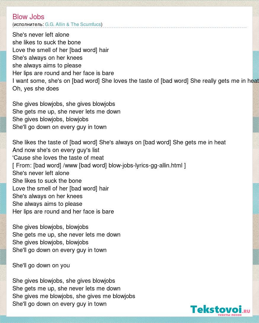 She's never left alone she likes to suck the bone Love the smell of her [bad word] hair She's always on her knees she always aims to please Her lips are round and her face is bare I want some, she's on the run She loves the taste of [bad word] She really gets me in heat Oh, yes she does She gives blowjobs, she gives blowjobs She gets me up, she never lets me down She gives blowjobs, blowjobs She'll go down on every guy in town She likes the taste of [bad word] She's always on the run She gets me in heat And now she's on every guy's list 'Cause she loves the taste of meat [ From: [bad word] /www [bad word] blow-jobs-lyrics-gg-allin.html ] She's never left alone She likes to suck the bone Love the smell of her [bad word] hair She's always on her knees She always aims to please Her lips are round and her face is bare She gives blowjobs, blowjobs She gets me up, she never lets me down She gives blowjobs, blowjobs She'll go down on every guy in town She'll go down on you She gives blowjobs, she gives blowjobs She gets me up, she never lets me down She gives me blowjobs, she gives me blowjobs She'll go down on every guy in town