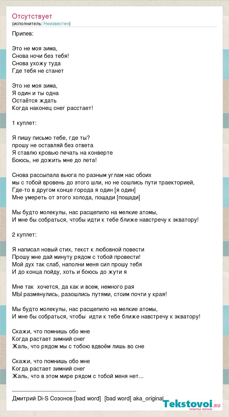 Припев: Это не моя зима, Снова ночи без тебя! Снова ухожу туда Где тебя не станет Это не моя зима, Я один и ты одна Остаётся ждать Когда наконец снег расстает! 1 куплет: Я пишу письмо тебе, где ты? прошу не оставляй без ответа Я ставлю кровью печать на конверте Боюсь, не дожить мне до лета! Снова рассыпала вьюга по разным углам нас обоих мы с тобой вровень до этого шли, но не сошлись пути траекторией, Где-то в другом конце города я один [я один] Мне умереть от этого холода, пощади [пощади] Мы будто молекулы, нас расщепило на мелкие атомы, И мне бы собраться, чтобы идти к тебе ближе навстречу к экватору! 2 куплет: Я написал новый стих, текст к любовной повести Прошу мне дай минуту рядом с тобой провести! Мой дух так слаб, наполни меня сил прошу тебя И до конца пойду, хоть и боюсь до жути я Мне так хочется, да как и всем, немного рая МЫ размянулись, разошлись путями, стоим почти у края! Мы будто молекулы, нас расщепило на мелкие атомы, И мне бы собраться, чтобы идти к тебе ближе навстречу к экватору! Скажи, что помнишь обо мне Когда растает зимний снег Жаль, что рядом мы с тобою вдвоём лишь во сне Скажи, что помнишь обо мне Когда растает зимний снег Жаль, что в этом мире рядом с тобой меня нет... -------------------------------- Дмитрий Di-S Созонов [bad word] [bad word] aka_original