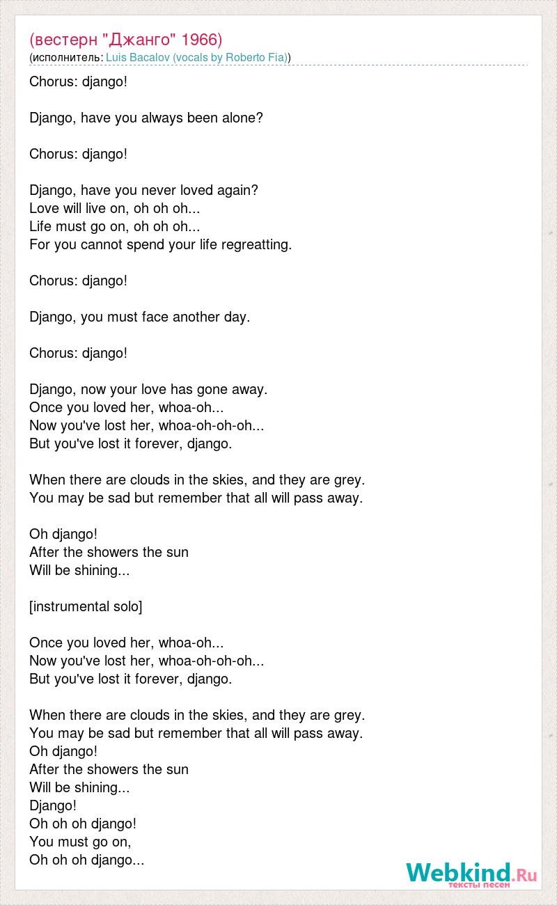 Chorus: django! Django, have you always been alone? Chorus: django! Django, have you never loved again? Love will live on, oh oh oh... Life must go on, oh oh oh... For you cannot spend your life regreatting. Chorus: django! Django, you must face another day. Chorus: django! Django, now your love has gone away. Once you loved her, whoa-oh... Now you've lost her, whoa-oh-oh-oh... But you've lost it forever, django. When there are clouds in the skies, and they are grey. You may be sad but remember that all will pass away. Oh django! After the showers the sun Will be shining... [instrumental solo] Once you loved her, whoa-oh... Now you've lost her, whoa-oh-oh-oh... But you've lost it forever, django. When there are clouds in the skies, and they are grey. You may be sad but remember that all will pass away. Oh django! After the showers the sun Will be shining... Django! Oh oh oh django! You must go on, Oh oh oh django...