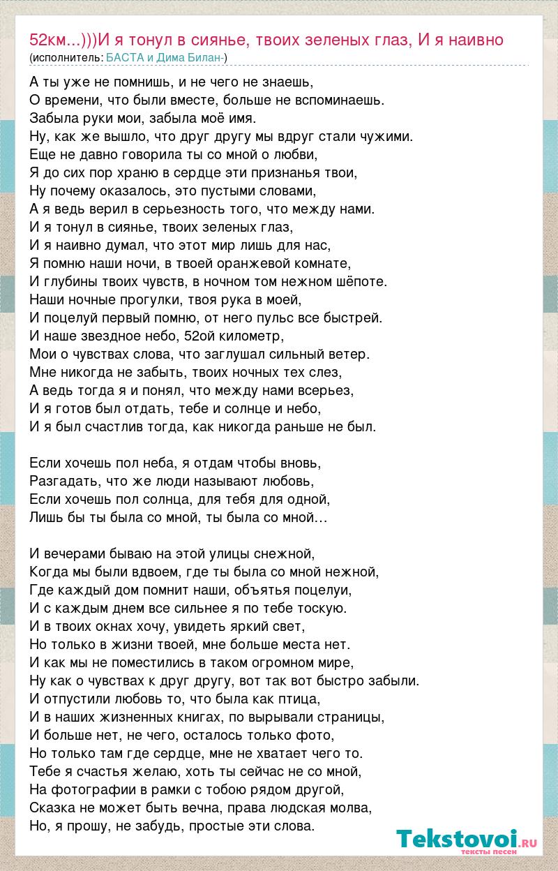 Главная→Исполнители→БАСТА и Дима Билан-→52км...)))И я тонул в сиянье, твоих зеленых глаз, И я наивно думал, что