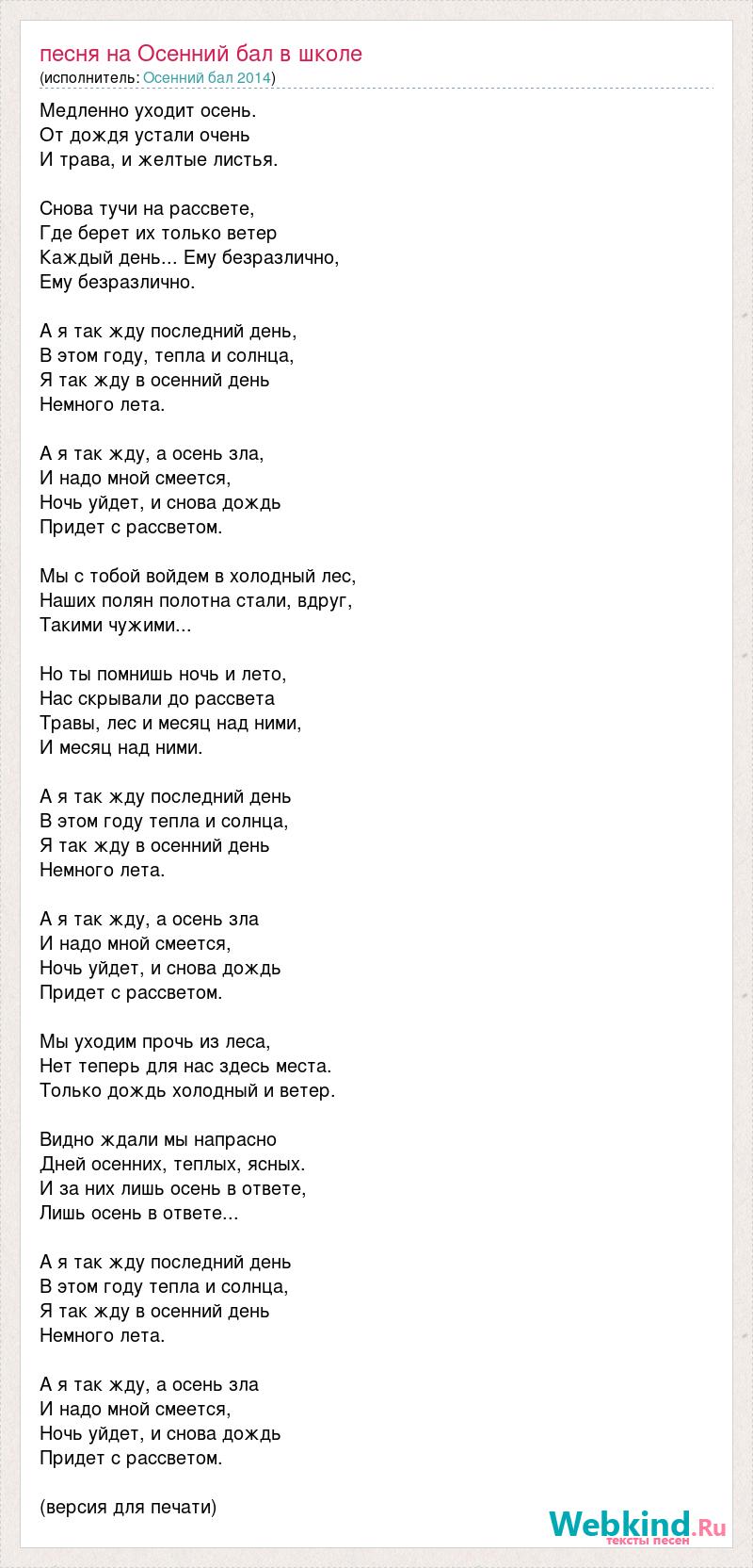 Медленно уходит осень. От дождя устали очень И трава, и желтые листья. Снова тучи на рассвете, Где берет их только ветер Каждый день... Ему безразлично, Ему безразлично. А я так жду последний день, В этом году, тепла и солнца, Я так жду в осенний день Немного лета. А я так жду, а осень зла, И надо мной смеется, Ночь уйдет, и снова дождь Придет с рассветом. Мы с тобой войдем в холодный лес, Наших полян полотна стали, вдруг, Такими чужими... Но ты помнишь ночь и лето, Нас скрывали до рассвета Травы, лес и месяц над ними, И месяц над ними. А я так жду последний день В этом году тепла и солнца, Я так жду в осенний день Немного лета. А я так жду, а осень зла И надо мной смеется, Ночь уйдет, и снова дождь Придет с рассветом. Мы уходим прочь из леса, Нет теперь для нас здесь места. Только дождь холодный и ветер. Видно ждали мы напрасно Дней осенних, теплых, ясных. И за них лишь осень в ответе, Лишь осень в ответе... А я так жду последний день В этом году тепла и солнца, Я так жду в осенний день Немного лета. А я так жду, а осень зла И надо мной смеется, Ночь уйдет, и снова дождь Придет с рассветом. (версия для печати)