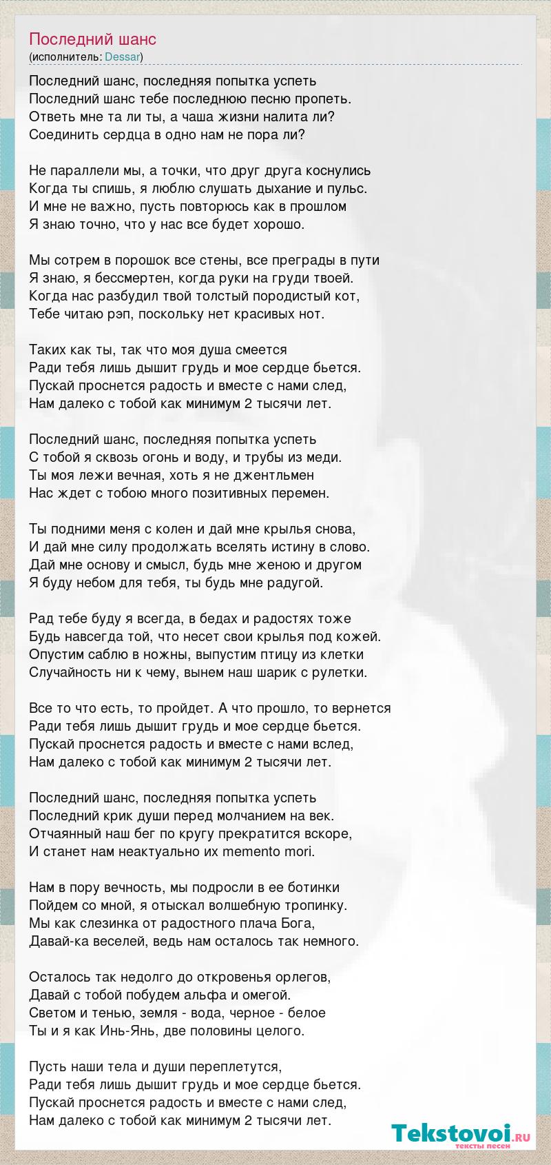 Последний шанс, последняя попытка успеть Последний шанс тебе последнюю песню пропеть. Ответь мне та ли ты, а чаша жизни налита ли? Соединить сердца в одно нам не пора ли? Не параллели мы, а точки, что друг друга коснулись Когда ты спишь, я люблю слушать дыхание и пульс. И мне не важно, пусть повторюсь как в прошлом Я знаю точно, что у нас все будет хорошо. Мы сотрем в порошок все стены, все преграды в пути Я знаю, я бессмертен, когда руки на груди твоей. Когда нас разбудил твой толстый породистый кот, Тебе читаю рэп, поскольку нет красивых нот. Таких как ты, так что моя душа смеется Ради тебя лишь дышит грудь и мое сердце бьется. Пускай проснется радость и вместе с нами след, Нам далеко с тобой как минимум 2 тысячи лет. Последний шанс, последняя попытка успеть С тобой я сквозь огонь и воду, и трубы из меди. Ты моя лежи вечная, хоть я не джентльмен Нас ждет с тобою много позитивных перемен. Ты подними меня с колен и дай мне крылья снова, И дай мне силу продолжать вселять истину в слово. Дай мне основу и смысл, будь мне женою и другом Я буду небом для тебя, ты будь мне радугой. Рад тебе буду я всегда, в бедах и радостях тоже Будь навсегда той, что несет свои крылья под кожей. Опустим саблю в ножны, выпустим птицу из клетки Случайность ни к чему, вынем наш шарик с рулетки. Все то что есть, то пройдет. А что прошло, то вернется Ради тебя лишь дышит грудь и мое сердце бьется. Пускай проснется радость и вместе с нами вслед, Нам далеко с тобой как минимум 2 тысячи лет. Последний шанс, последняя попытка успеть Последний крик души перед молчанием на век. Отчаянный наш бег по кругу прекратится вскоре, И станет нам неактуально их memento mori. Нам в пору вечность, мы подросли в ее ботинки Пойдем со мной, я отыскал волшебную тропинку. Мы как слезинка от радостного плача Бога, Давай-ка веселей, ведь нам осталось так немного. Осталось так недолго до откровенья орлегов, Давай с тобой побудем альфа и омегой. Светом и тенью, земля - вода, черное - белое Ты и я как Инь-Янь, две половины целого. Пусть наши тела и души переплетутся, Ради тебя лишь дышит грудь и мое сердце бьется. Пускай проснется радость и вместе с нами след, Нам далеко с тобой как минимум 2 тысячи лет.