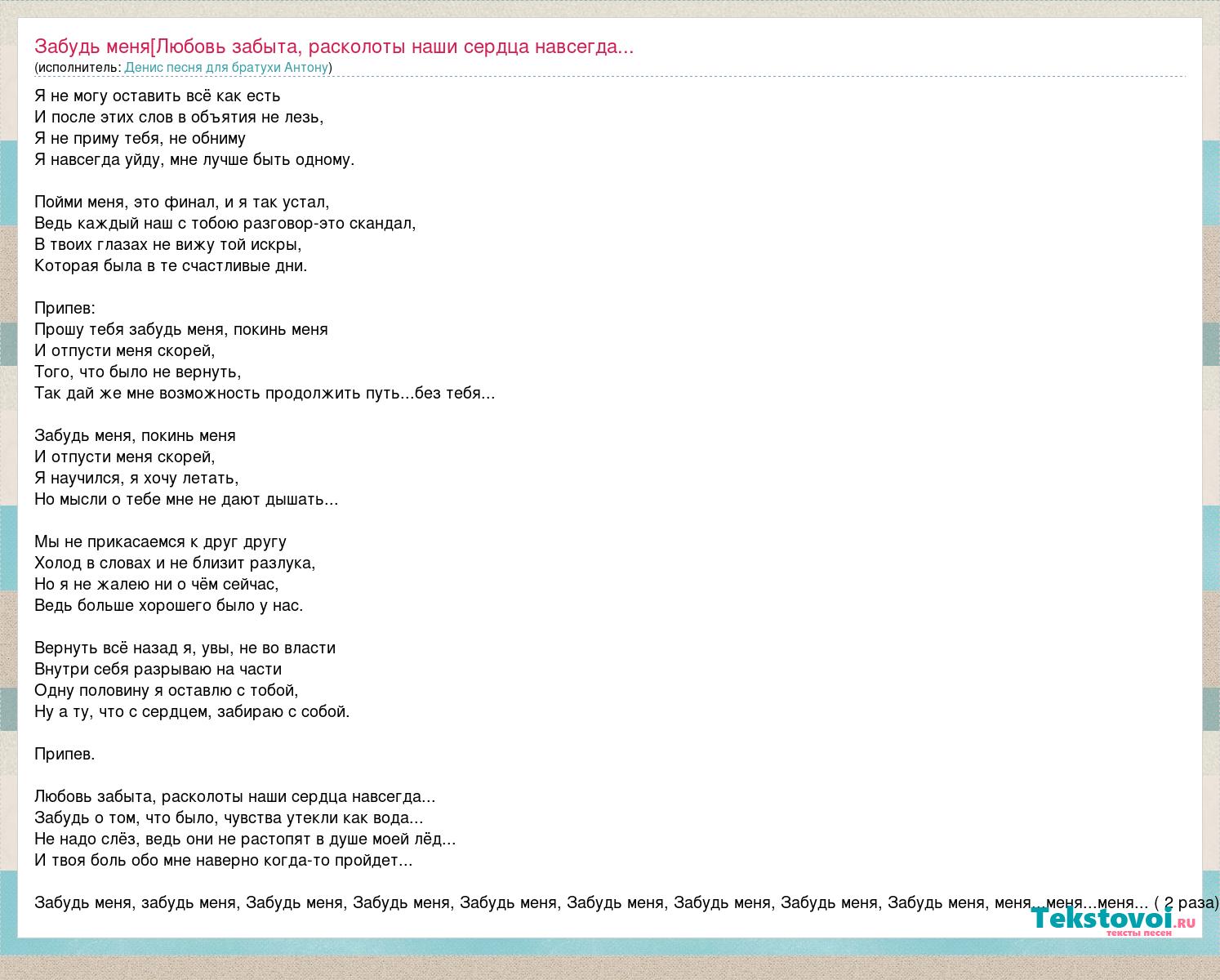 Я не могу оставить всё как есть И после этих слов в объятия не лезь, Я не приму тебя, не обниму Я навсегда уйду, мне лучше быть одному. Пойми меня, это финал, и я так устал, Ведь каждый наш с тобою разговор-это скандал, В твоих глазах не вижу той искры, Которая была в те счастливые дни. Припев: Прошу тебя забудь меня, покинь меня И отпусти меня скорей, Того, что было не вернуть, Так дай же мне возможность продолжить путь...без тебя... Забудь меня, покинь меня И отпусти меня скорей, Я научился, я хочу летать, Но мысли о тебе мне не дают дышать... Мы не прикасаемся к друг другу Холод в словах и не близит разлука, Но я не жалею ни о чём сейчас, Ведь больше хорошего было у нас. Вернуть всё назад я, увы, не во власти Внутри себя разрываю на части Одну половину я оставлю с тобой, Ну а ту, что с сердцем, забираю с собой. Припев. Любовь забыта, расколоты наши сердца навсегда... Забудь о том, что было, чувства утекли как вода... Не надо слёз, ведь они не растопят в душе моей лёд... И твоя боль обо мне наверно когда-то пройдет... Забудь меня, забудь меня, Забудь меня, Забудь меня, Забудь меня, Забудь меня, Забудь меня, Забудь меня, Забудь меня, меня...меня...меня... ( 2 раза)