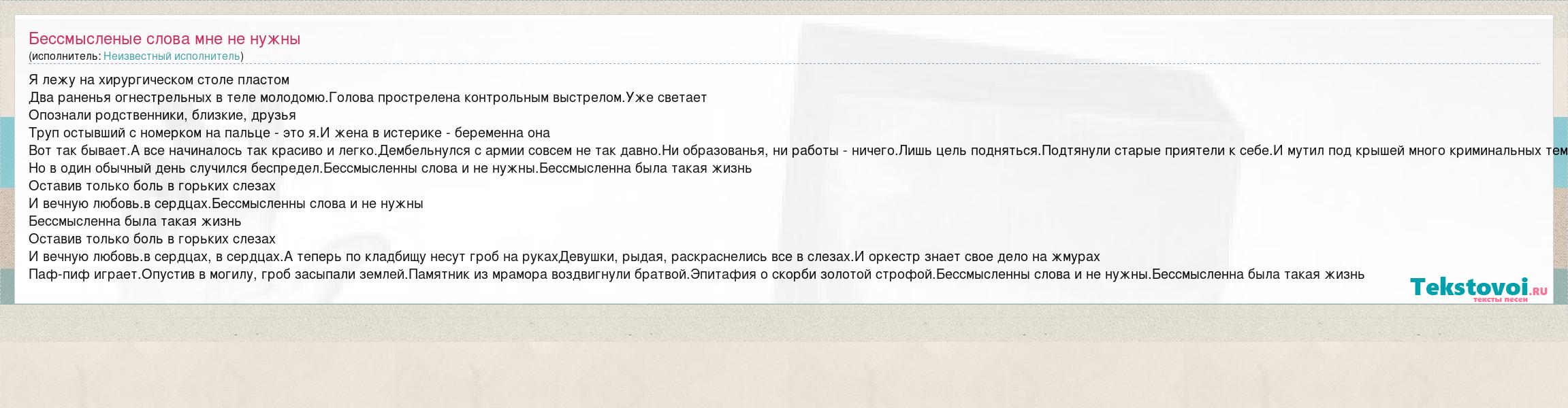 Я лежу на хирургическом столе пластом Два раненья огнестрельных в теле молодомю.Голова прострелена контрольным выстрелом.Уже светает Опознали родственники, близкие, друзья Труп остывший с номерком на пальце - это я.И жена в истерике - беременна она Вот так бывает.А все начиналось так красиво и легко.Дембельнулся с армии совсем не так давно.Ни образованья, ни работы - ничего.Лишь цель подняться.Подтянули старые приятели к себе.И мутил под крышей много криминальных тем Но в один обычный день случился беспредел.Бессмысленны слова и не нужны.Бессмысленна была такая жизнь Оставив только боль в горьких слезах И вечную любовь.в сердцах.Бессмысленны слова и не нужны Бессмысленна была такая жизнь Оставив только боль в горьких слезах И вечную любовь.в сердцах, в сердцах.А теперь по кладбищу несут гроб на рукахДевушки, рыдая, раскраснелись все в слезах.И оркестр знает свое дело на жмурах Паф-пиф играет.Опустив в могилу, гроб засыпали землей.Памятник из мрамора воздвигнули братвой.Эпитафия о скорби золотой строфой.Бессмысленны слова и не нужны.Бессмысленна была такая жизнь