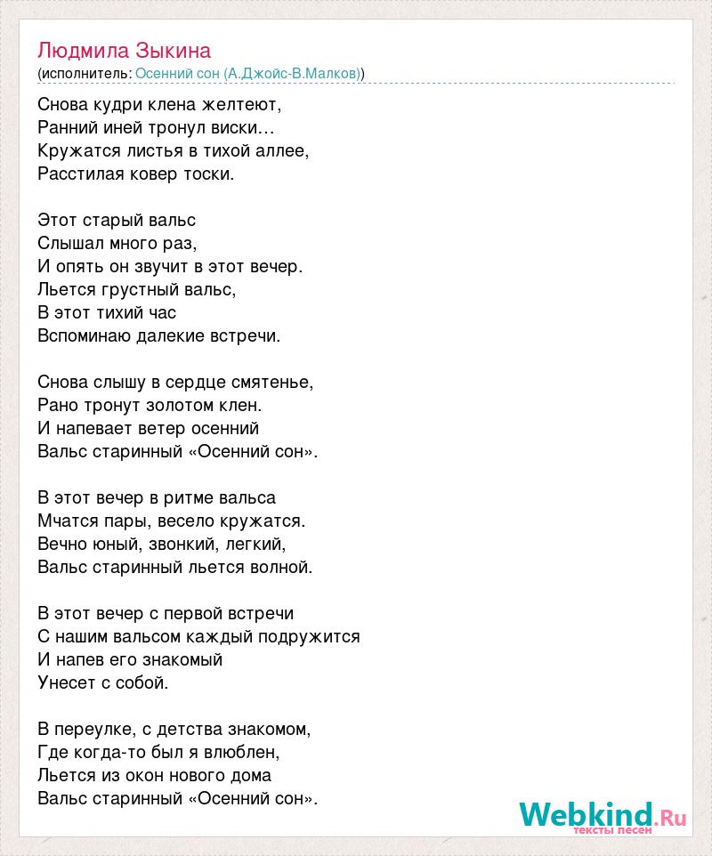 Снова кудри клена желтеют, Ранний иней тронул виски… Кружатся листья в тихой аллее, Расстилая ковер тоски. Этот старый вальс Слышал много раз, И опять он звучит в этот вечер. Льется грустный вальс, В этот тихий час Вспоминаю далекие встречи. Снова слышу в сердце смятенье, Рано тронут золотом клен. И напевает ветер осенний Вальс старинный «Осенний сон». В этот вечер в ритме вальса Мчатся пары, весело кружатся. Вечно юный, звонкий, легкий, Вальс старинный льется волной. В этот вечер с первой встречи С нашим вальсом каждый подружится И напев его знакомый Унесет с собой. В переулке, с детства знакомом, Где когда-то был я влюблен, Льется из окон нового дома Вальс старинный «Осенний сон».