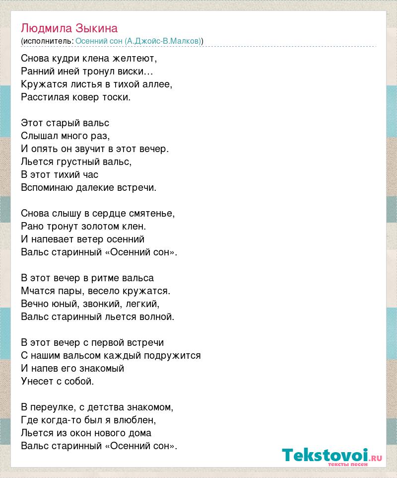 Снова кудри клена желтеют, Ранний иней тронул виски… Кружатся листья в тихой аллее, Расстилая ковер тоски. Этот старый вальс Слышал много раз, И опять он звучит в этот вечер. Льется грустный вальс, В этот тихий час Вспоминаю далекие встречи. Снова слышу в сердце смятенье, Рано тронут золотом клен. И напевает ветер осенний Вальс старинный «Осенний сон». В этот вечер в ритме вальса Мчатся пары, весело кружатся. Вечно юный, звонкий, легкий, Вальс старинный льется волной. В этот вечер с первой встречи С нашим вальсом каждый подружится И напев его знакомый Унесет с собой. В переулке, с детства знакомом, Где когда-то был я влюблен, Льется из окон нового дома Вальс старинный «Осенний сон».