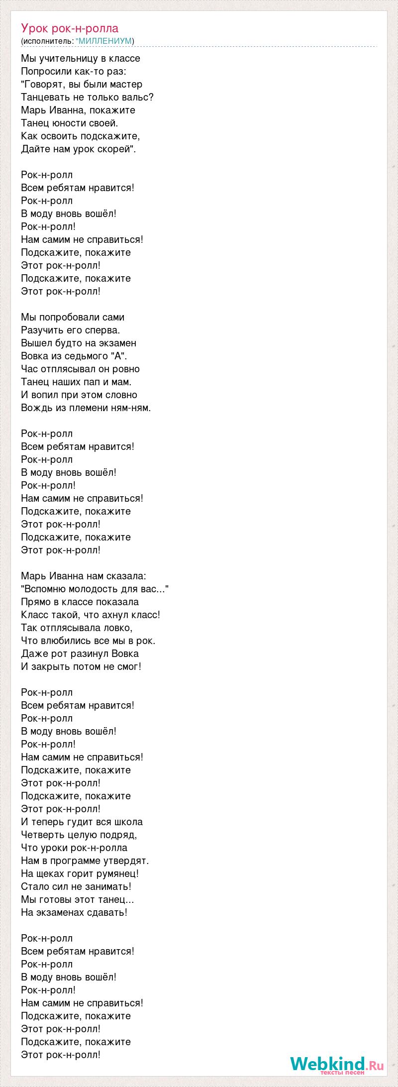 Мы учительницу в классе Попросили как-то раз: "Говорят, вы были мастер Танцевать не только вальс? Марь Иванна, покажите Танец юности своей. Как освоить подскажите, Дайте нам урок скорей". Рок-н-ролл Всем ребятам нравится! Рок-н-ролл В моду вновь вошёл! Рок-н-ролл! Нам самим не справиться! Подскажите, покажите Этот рок-н-ролл! Подскажите, покажите Этот рок-н-ролл! Мы попробовали сами Разучить его сперва. Вышел будто на экзамен Вовка из седьмого "А". Час отплясывал он ровно Танец наших пап и мам. И вопил при этом словно Вождь из племени ням-ням. Рок-н-ролл Всем ребятам нравится! Рок-н-ролл В моду вновь вошёл! Рок-н-ролл! Нам самим не справиться! Подскажите, покажите Этот рок-н-ролл! Подскажите, покажите Этот рок-н-ролл! Марь Иванна нам сказала: "Вспомню молодость для вас..." Прямо в классе показала Класс такой, что ахнул класс! Так отплясывала ловко, Что влюбились все мы в рок. Даже рот разинул Вовка И закрыть потом не смог! Рок-н-ролл Всем ребятам нравится! Рок-н-ролл В моду вновь вошёл! Рок-н-ролл! Нам самим не справиться! Подскажите, покажите Этот рок-н-ролл! Подскажите, покажите Этот рок-н-ролл! И теперь гудит вся школа Четверть целую подряд, Что уроки рок-н-ролла Нам в программе утвердят. На щеках горит румянец! Стало сил не занимать! Мы готовы этот танец... На экзаменах сдавать! Рок-н-ролл Всем ребятам нравится! Рок-н-ролл В моду вновь вошёл! Рок-н-ролл! Нам самим не справиться! Подскажите, покажите Этот рок-н-ролл! Подскажите, покажите Этот рок-н-ролл!