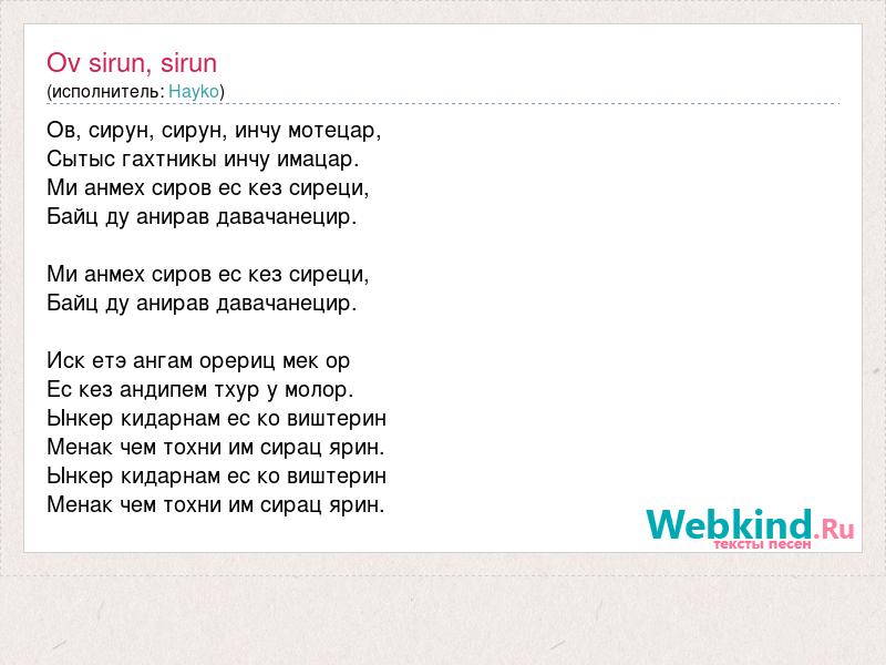 Ов, сирун, сирун, инчу мотецар, Сытыс гахтникы инчу имацар. Ми анмех сиров ес кез сиреци, Байц ду анирав давачанецир. Ми анмех сиров ес кез сиреци, Байц ду анирав давачанецир. Иск етэ ангам орериц мек ор Ес кез андипем тхур у молор. Ынкер кидарнам ес ко виштерин Менак чем тохни им сирац ярин. Ынкер кидарнам ес ко виштерин Менак чем тохни им сирац ярин.