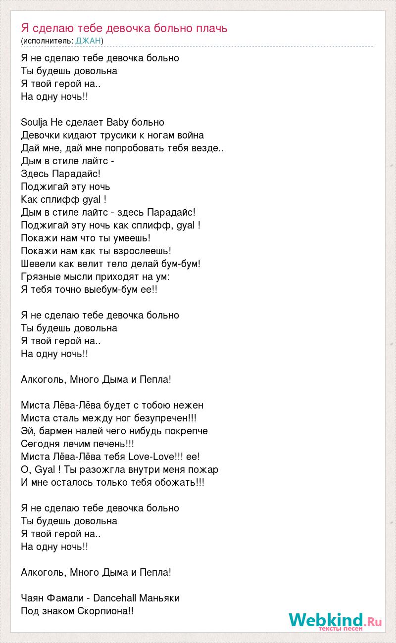 Я не сделаю тебе девочка больно Ты будешь довольна Я твой герой на.. На одну ночь!! Soulja Не сделает Baby больно Девочки кидают трусики к ногам война Дай мне, дай мне попробовать тебя везде.. Дым в стиле лайтс - Здесь Парадайс! Поджигай эту ночь Как сплифф gyal ! Дым в стиле лайтс - здесь Парадайс! Поджигай эту ночь как сплифф, gyal ! Покажи нам что ты умеешь! Покажи нам как ты взрослеешь! Шевели как велит тело делай бум-бум! Грязные мысли приходят на ум: Я тебя точно выебум-бум ее!! Я не сделаю тебе девочка больно Ты будешь довольна Я твой герой на.. На одну ночь!! Алкоголь, Много Дыма и Пепла! Миста Лёва-Лёва будет с тобою нежен Миста сталь между ног безупречен!!! Эй, бармен налей чего нибудь покрепче Сегодня лечим печень!!! Миста Лёва-Лёва тебя Love-Love!!! ее! O, Gyal ! Ты разожгла внутри меня пожар И мне осталось только тебя обожать!!! Я не сделаю тебе девочка больно Ты будешь довольна Я твой герой на.. На одну ночь!! Алкоголь, Много Дыма и Пепла! Чаян Фамали - Dancehall Маньяки Под знаком Скорпиона!!