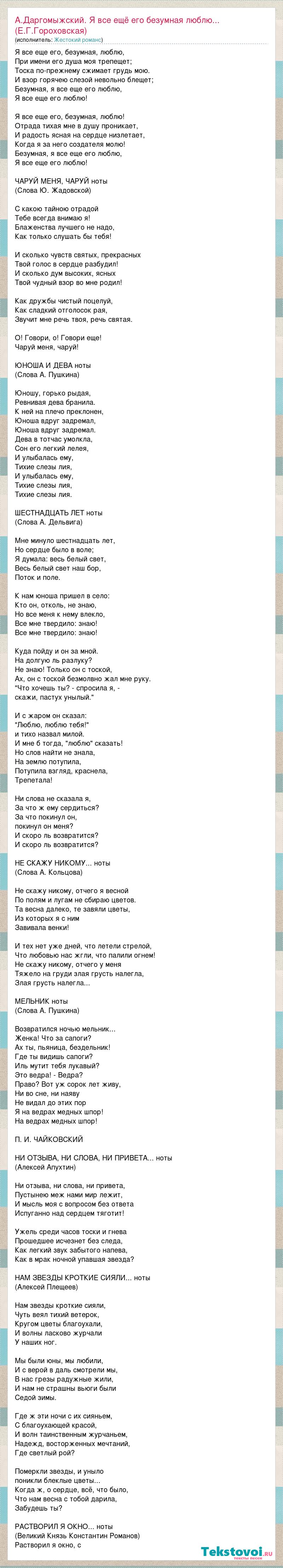 Я все еще его, безумная, люблю, При имени его душа моя трепещет; Тоска по-прежнему сжимает грудь мою. И взор горячею слезой невольно блещет; Безумная, я все еще его люблю, Я все еще его люблю! Я все еще его, безумная, люблю! Отрада тихая мне в душу проникает, И радость ясная на сердце низлетает, Когда я за него создателя молю! Безумная, я все еще его люблю, Я все еще его люблю! ЧАРУЙ МЕНЯ, ЧАРУЙ ноты (Слова Ю. Жадовской) С какою тайною отрадой Тебе всегда внимаю я! Блаженства лучшего не надо, Как только слушать бы тебя! И сколько чувств святых, прекрасных Твой голос в сердце разбудил! И сколько дум высоких, ясных Твой чудный взор во мне родил! Как дружбы чистый поцелуй, Как сладкий отголосок рая, Звучит мне речь твоя, речь святая. О! Говори, о! Говори еще! Чаруй меня, чаруй! ЮНОША И ДЕВА ноты (Слова А. Пушкина) Юношу, горько рыдая, Ревнивая дева бранила. К ней на плечо преклонен, Юноша вдруг задремал, Юноша вдруг задремал. Дева в тотчас умолкла, Сон его легкий лелея, И улыбалась ему, Тихие слезы лия, И улыбалась ему, Тихие слезы лия, Тихие слезы лия. ШЕСТНАДЦАТЬ ЛЕТ ноты (Слова А. Дельвига) Мне минуло шестнадцать лет, Но сердце было в воле; Я думала: весь белый свет, Весь белый свет наш бор, Поток и поле. К нам юноша пришел в село: Кто он, отколь, не знаю, Но все меня к нему влекло, Все мне твердило: знаю! Все мне твердило: знаю! Куда пойду и он за мной. На долгую ль разлуку? Не знаю! Только он с тоской, Ах, он с тоской безмолвно жал мне руку. "Что хочешь ты? - спросила я, - скажи, пастух унылый." И с жаром он сказал: "Люблю, люблю тебя!" и тихо назвал милой. И мне б тогда, "люблю" сказать! Но слов найти не знала, На землю потупила, Потупила взгляд, краснела, Трепетала! Ни слова не сказала я, За что ж ему сердиться? За что покинул он, покинул он меня? И скоро ль возвратится? И скоро ль возвратится? НЕ СКАЖУ НИКОМУ... ноты (Слова А. Кольцова) Не скажу никому, отчего я весной По полям и лугам не сбираю цветов. Та весна далеко, те завяли цветы, Из которых я с ним Завивала венки! И тех нет уже дней, что летели стрелой, Что любовью нас жгли, что палили огнем! Не скажу никому, отчего у меня Тяжело на груди злая грусть налегла, Злая грусть налегла... МЕЛЬНИК ноты (Слова А. Пушкина) Возвратился ночью мельник... Женка! Что за сапоги? Ах ты, пьяница, бездельник! Где ты видишь сапоги? Иль мутит тебя лукавый? Это ведра! - Ведра? Право? Вот уж сорок лет живу, Ни во сне, ни наяву Не видал до этих пор Я на ведрах медных шпор! На ведрах медных шпор! П. И. ЧАЙКОВСКИЙ НИ ОТЗЫВА, НИ СЛОВА, НИ ПРИВЕТА... ноты (Алексей Апухтин) Ни отзыва, ни слова, ни привета, Пустынею меж нами мир лежит, И мысль моя с вопросом без ответа Испуганно над сердцем тяготит! Ужель среди часов тоски и гнева Прошедшее исчезнет без следа, Как легкий звук забытого напева, Как в мрак ночной упавшая звезда? НАМ ЗВЕЗДЫ КРОТКИЕ СИЯЛИ... ноты (Алексей Плещеев) Нам звезды кроткие сияли, Чуть веял тихий ветерок, Кругом цветы благоухали, И волны ласково журчали У наших ног. Мы были юны, мы любили, И с верой в даль смотрели мы, В нас грезы радужные жили, И нам не страшны вьюги были Седой зимы. Где ж эти ночи с их сияньем, С благоухающей красой, И волн таинственным журчаньем, Надежд, восторженных мечтаний, Где светлый рой? Померкли звезды, и уныло поникли блеклые цветы... Когда ж, о сердце, всё, что было, Что нам весна с тобой дарила, Забудешь ты? РАСТВОРИЛ Я ОКНО... ноты (Великий Князь Конст